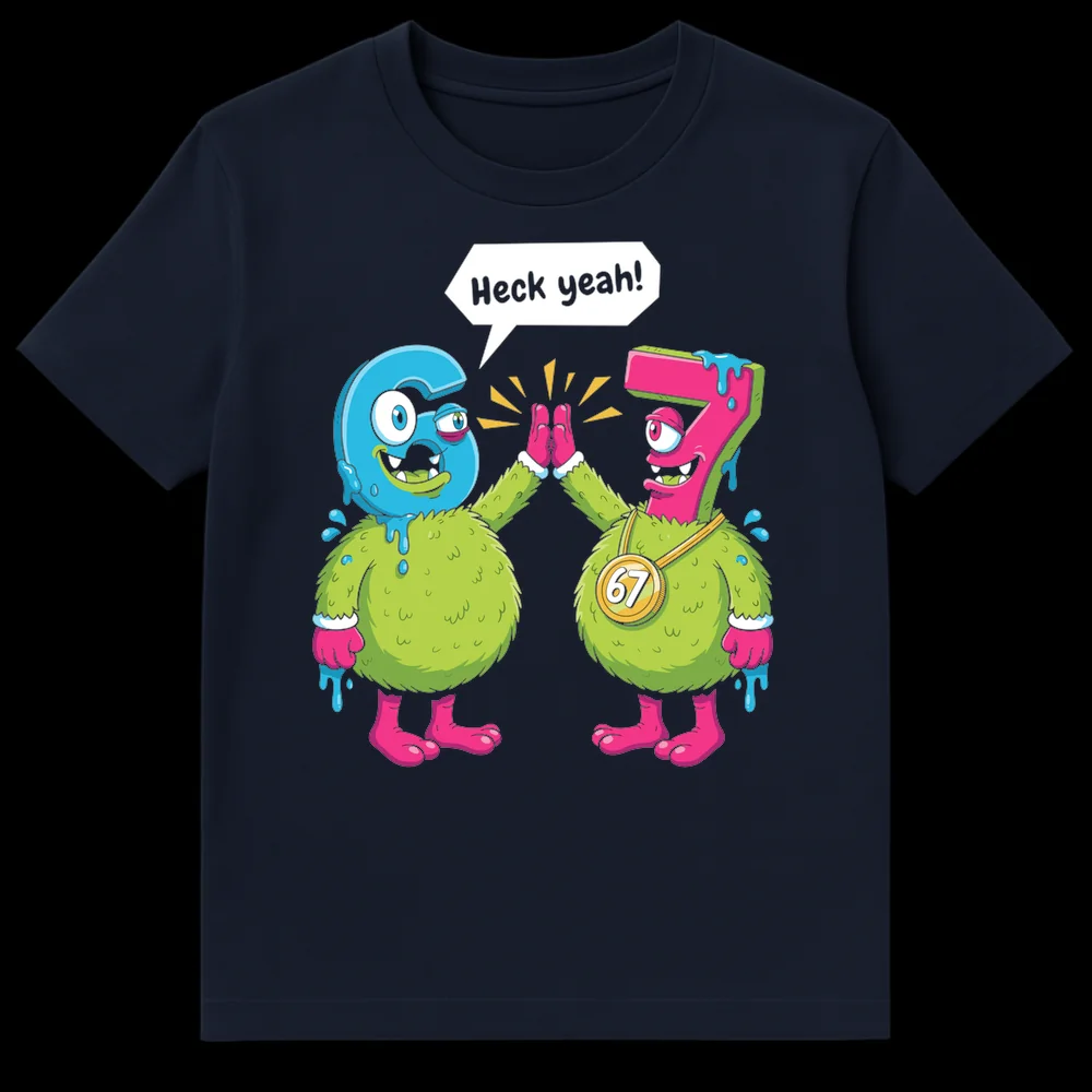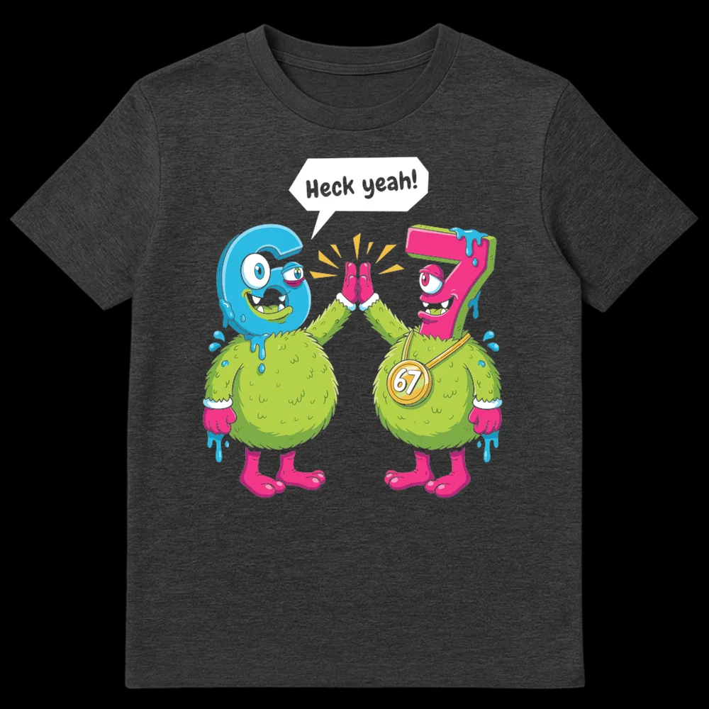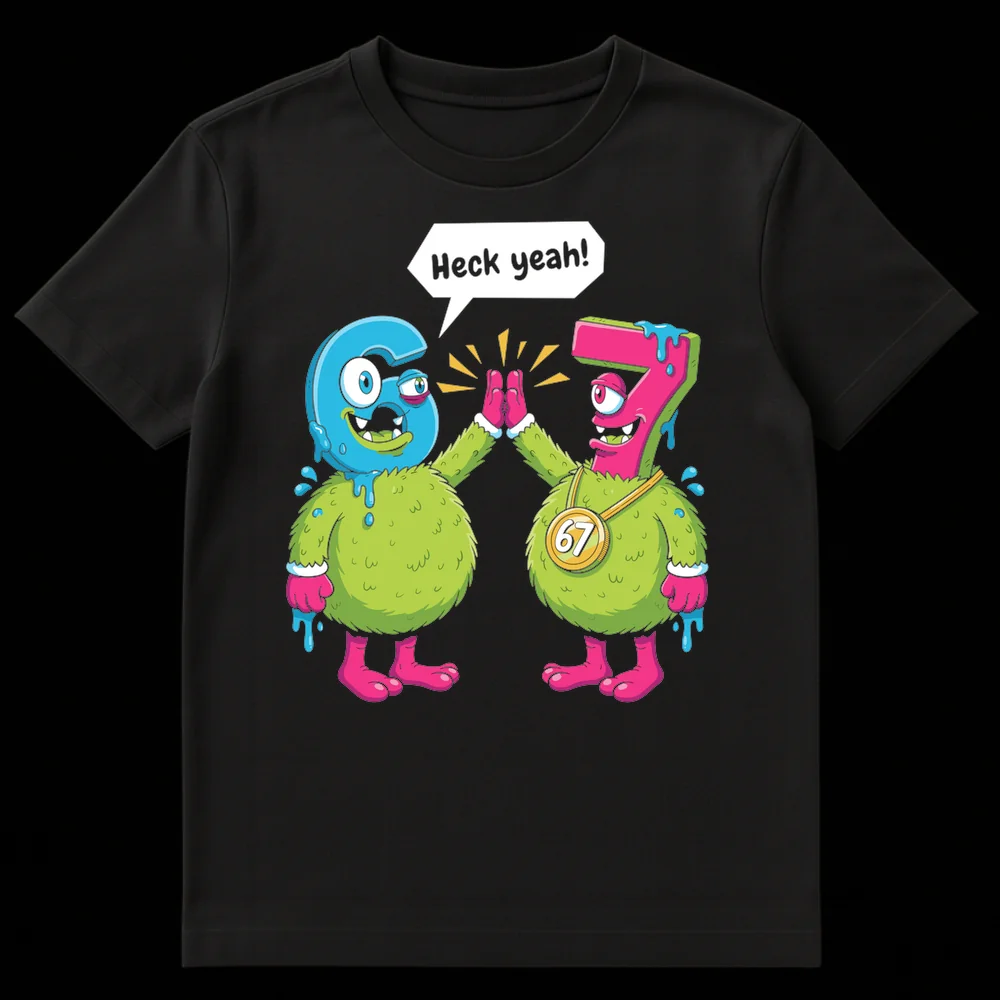 Celebrate math friendship with our ‘Heck Yeah!’ tee! This vibrant design humorously subverts the classic ‘7 ate 9′ joke, showing 6 and 7 as triumphant, high-fiving monster numbers. Featuring a ’67’ medal, it’s a clever twist for anyone who loves puns and playful art. Perfect gift for math teachers, students, or anyone with a quirky sense of humor.