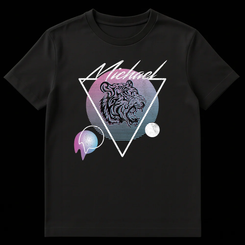 Step back into the neon-drenched glory of the 80s with our exclusive “Michael” Synthwave Tiger Sunset T-Shirt. This design is a masterclass in retrofuturism, blending a fierce roaring tiger head with a breathtaking pink-to-blue retrowave sunset gradient. Geometric shapes like a prominent triangle and distressed circles frame the scene, creating a visually stunning tribute to classic arcade graphics and VHS aesthetics. The name “Michael” is elegantly integrated in a stylized script, personalizing this powerful design for a specific individual. The chromatic aberration effect on the tiger adds a glitchy, authentic analog distortion, ensuring this tee stands out. It’s more than just a shirt; it’s an expression of power, confidence, and a deep appreciation for a unique cultural era. Perfect for fans of synthwave music, 80s movies, and anyone who wants to showcase their retro style. Give the ultimate personalized gift to the Michael in your life who embodies this vibrant aesthetic.