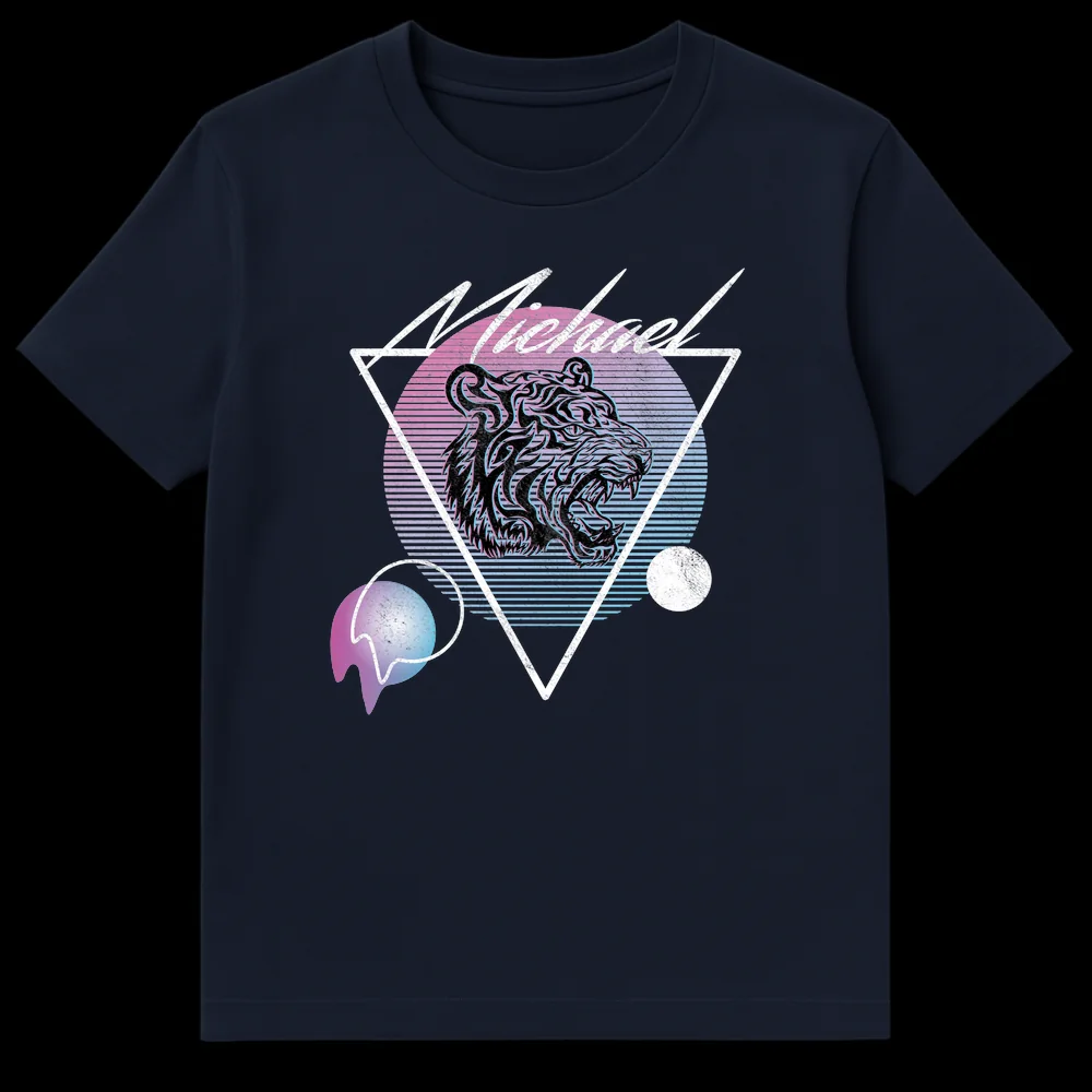 Unleash your inner beast with this personalized “Michael” Synthwave Tiger Sunset T-Shirt. Featuring a roaring tiger, vibrant retrowave gradient, and iconic 80s geometry, this design perfectly captures the essence of retrofuturism. It’s a striking statement piece that pays homage to classic arcade aesthetics and electronic music. An ideal gift for any Michael who loves 80s nostalgia and powerful animal designs.