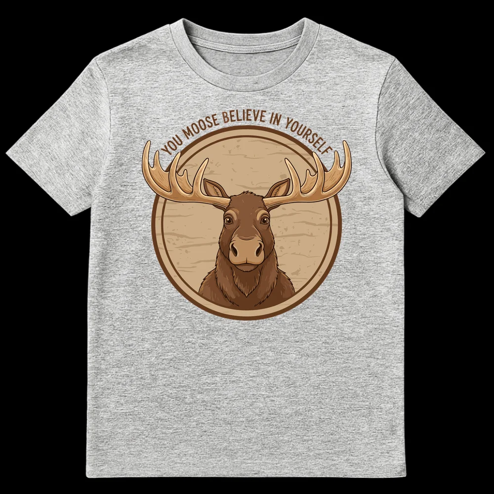 Embrace encouragement with our hilarious ‘YOU MOOSE BELIEVE IN YOURSELF’ t-shirt. This design features a charming cartoon moose on a rustic plaque, transforming a classic motivational phrase into a witty animal pun. Perfect for nature lovers, pun enthusiasts, or anyone needing a lighthearted boost. It makes a delightful gift for friends and family who appreciate wholesome humor and the great outdoors.