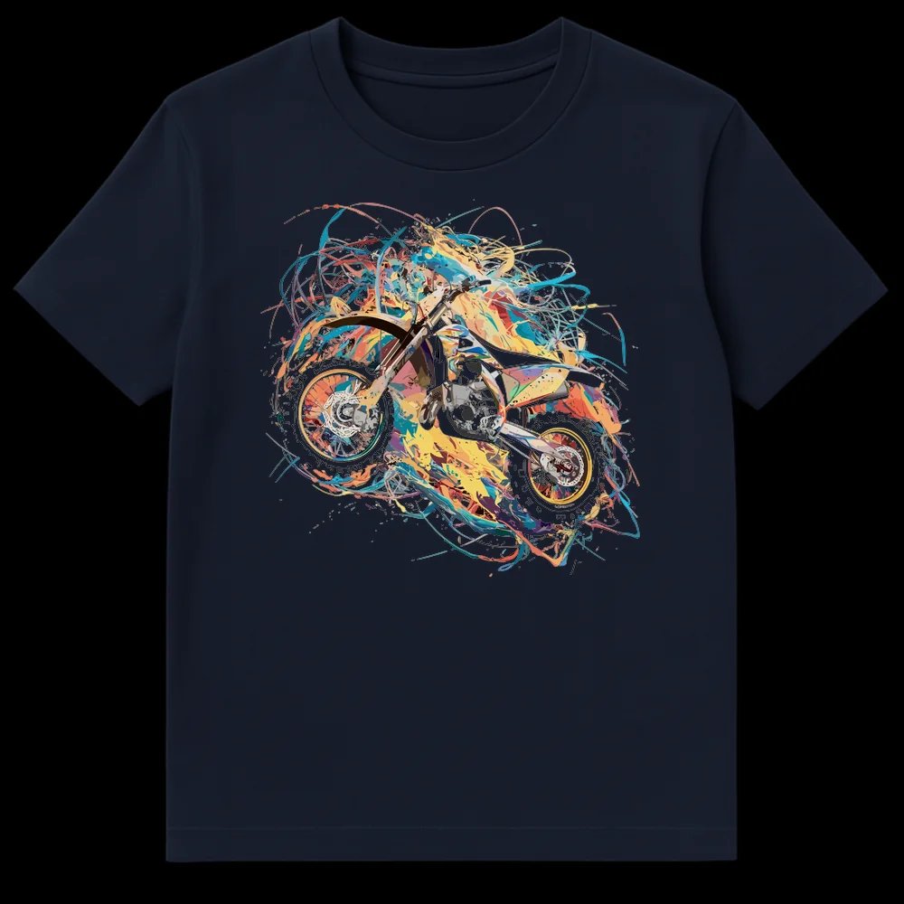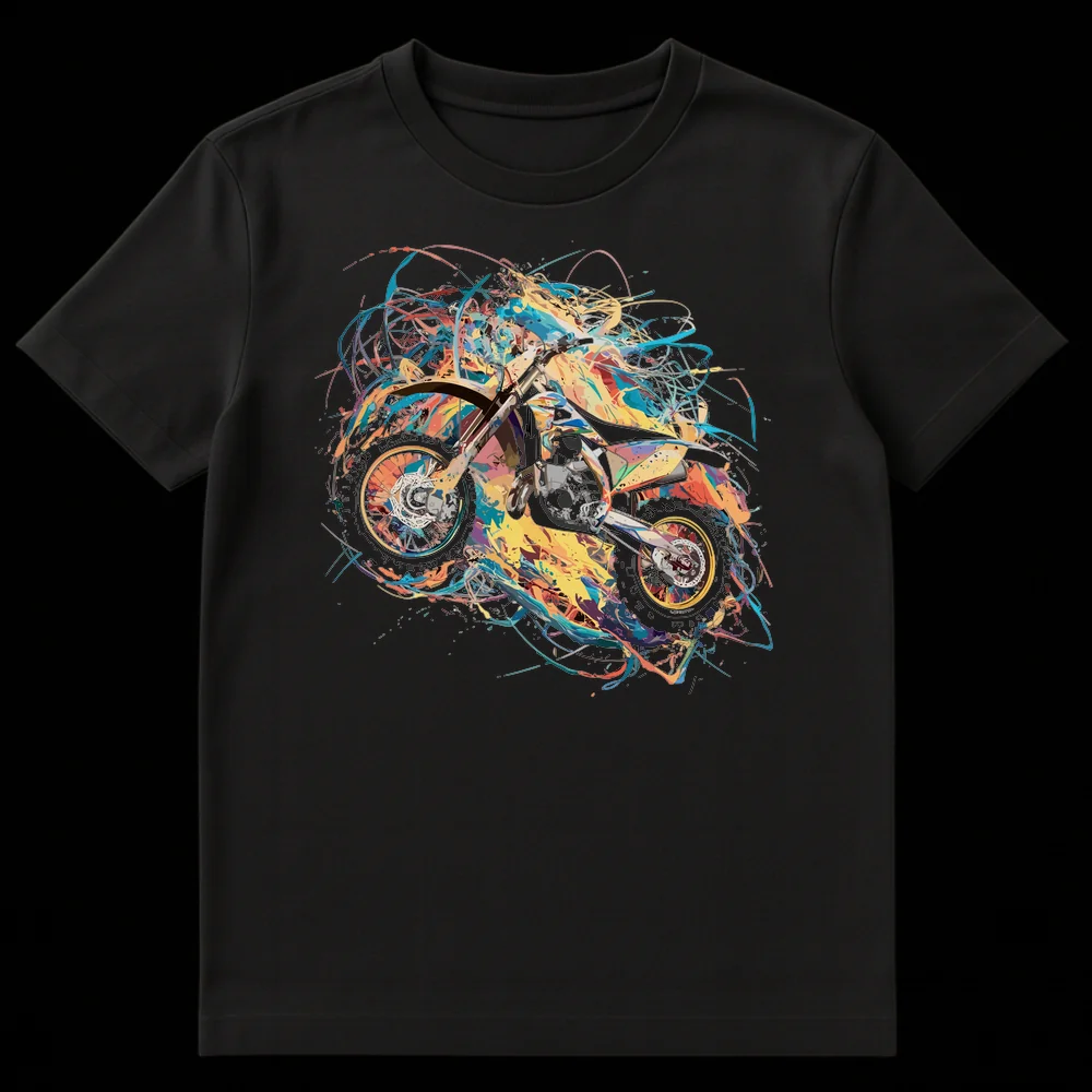 Unleash your passion for extreme sports with this dynamic dirt bike t-shirt. Featuring a stunning abstract expressionist design, the motocross bike explodes in a vibrant splash of colors against a deep black background, capturing the thrill and energy of the sport. It’s the perfect gift for any dirt biking enthusiast or fan of bold, action-oriented art.