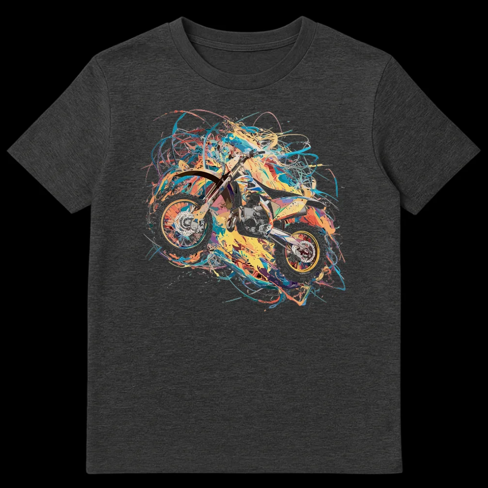 Embrace the adrenaline of motocross with our unique Splash Art Dirt Bike T-Shirt. This design isn’t just a garment; it’s a statement piece, blending the raw power of a dirt bike with the vibrant chaos of abstract expressionist art. The motocross motorcycle is depicted as a burst of dynamic color—oranges, blues, greens, and purples—creating a powerful illusion of speed and energy, all popping against a sleek black canvas. There’s no text, letting the visually striking bike and its explosive, fluid artistry speak volumes about the thrill of extreme sports. It’s an ideal gift for motocross riders, dirt biking fans, or anyone who loves adventurous, high-energy designs that truly stand out.
