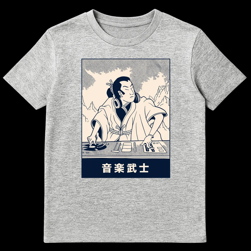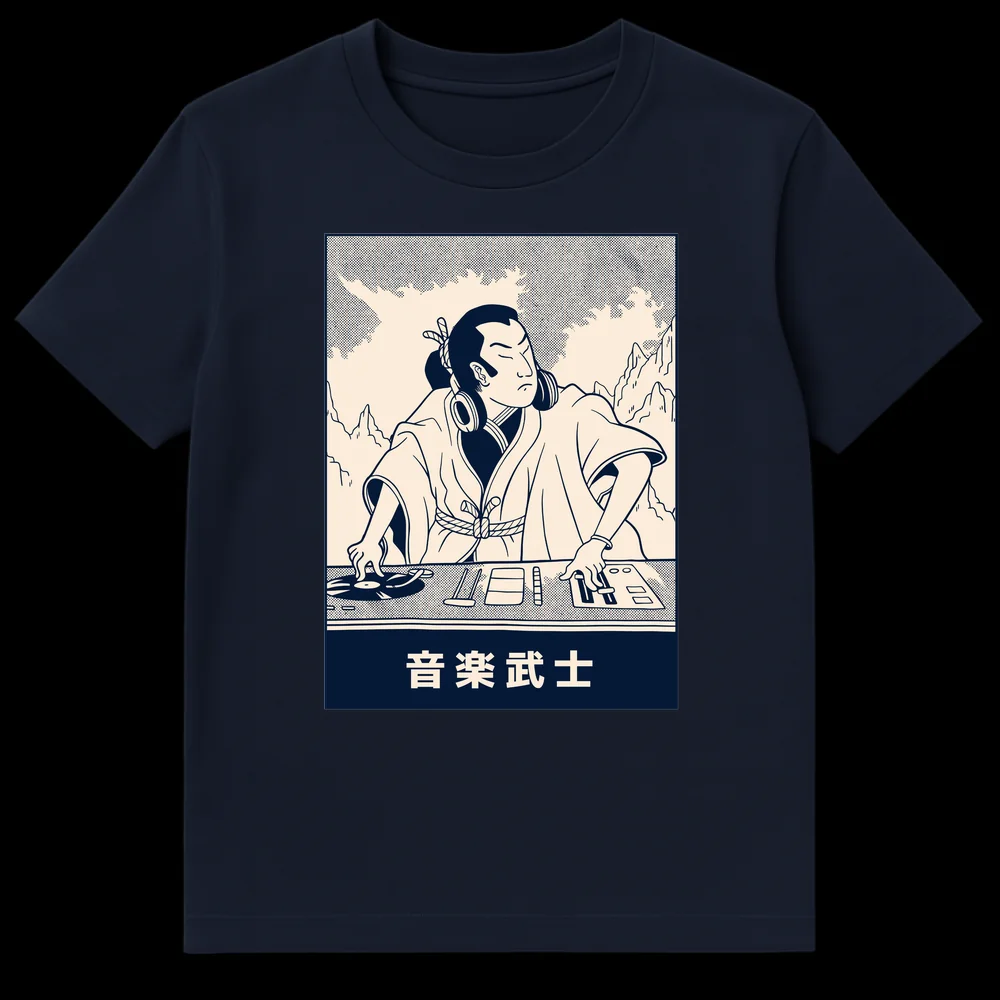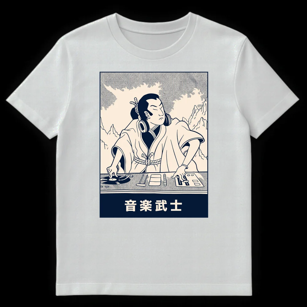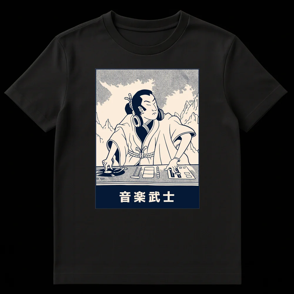 Step up your style game with our ‘Music Warrior’ Samurai DJ T-shirt, a captivating design that flawlessly fuses ancient Japanese tradition with contemporary music culture. This unique graphic tee features a disciplined samurai, clad in traditional attire, intently spinning tracks on modern DJ equipment. The striking visual pun, combined with the Japanese characters ‘音楽æ¦å£«’ (Ongaku Bushi) translating to ‘Music Warrior’ or ‘Music Samurai,’ creates an unforgettable statement. Perfect for those who appreciate cultural mashups, electronic music, hip-hop culture, or Japanese art, this shirt is more than just apparel—it’s a conversation starter. Its Ukiyo-e inspired style and limited color palette evoke a vintage aesthetic while celebrating modern passion. Gift it to the DJ, music producer, or anime enthusiast in your life who embodies the warrior spirit in their craft.