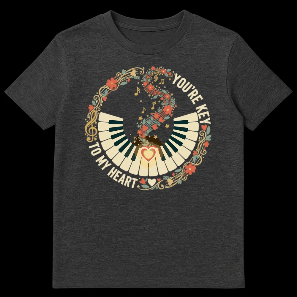 Express your love with this charming “YOU’RE KEY TO MY HEART” t-shirt, featuring a beautiful piano keyboard design, musical notes, and delicate floral accents. This sweet and clever pun design is perfect for musicians, pianists, or anyone who cherishes a heartfelt romantic gesture. It makes an ideal gift for your significant other, music teacher, or a beloved friend.