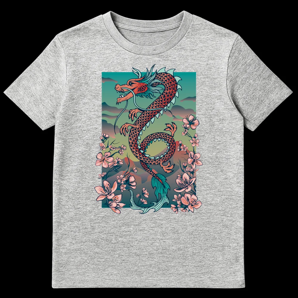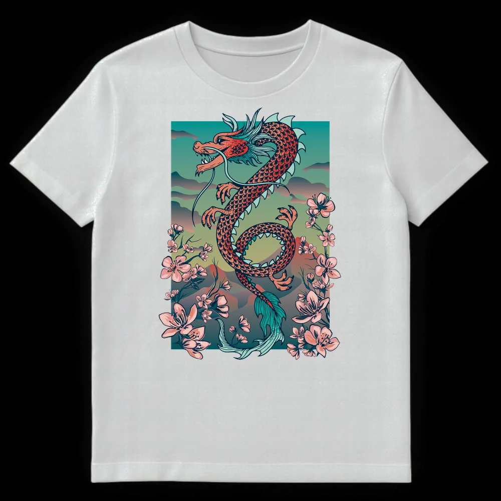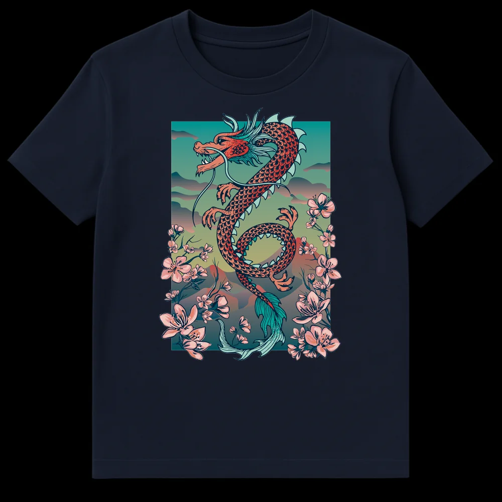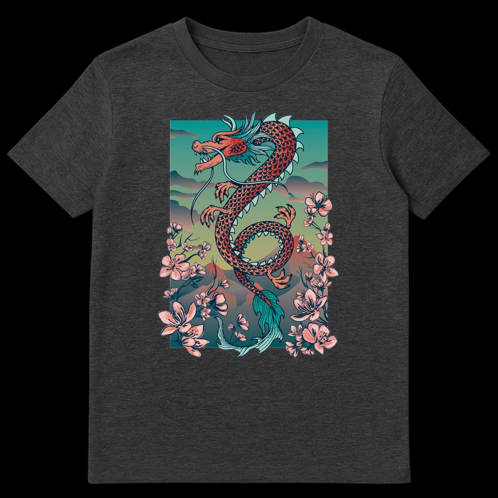 Unleash your inner spirit with our captivating East Asian Dragon & Cherry Blossom t-shirt. This intricate design brings together the powerful symbolism of a mythical, serpentine dragon—representing strength, wisdom, and good fortune in Eastern cultures—with the delicate beauty of cherry blossoms, symbolizing life’s transient beauty and renewal. The harmonious blend of vibrant coral red, serene teal, and soft pinks, accented by elegant outlines, creates a visually striking and culturally rich aesthetic. With no text, the art speaks for itself, making a profound statement. This premium t-shirt is an ideal present for mythology enthusiasts, fans of Japanese and Chinese art, fantasy lovers, or anyone seeking a unique garment that celebrates cultural depth and natural elegance. Wear a piece of wearable art that evokes awe, serenity, and sophistication, perfect for making a stylish impression.