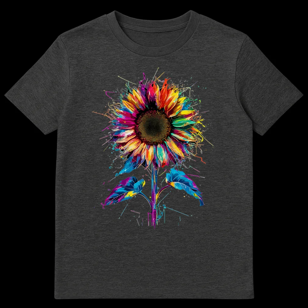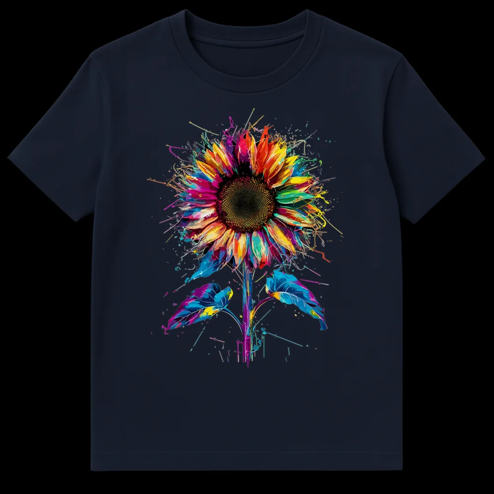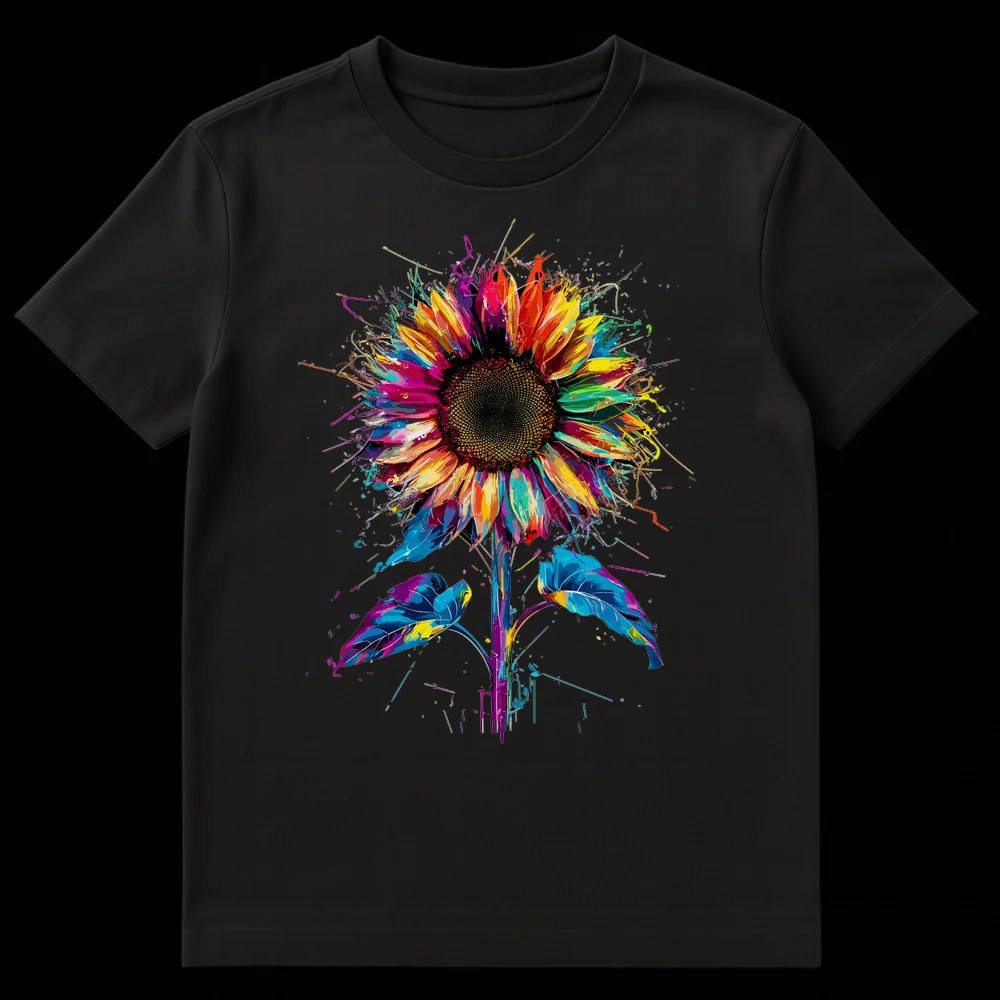 Embrace the joy and energy of nature with our stunning Vibrant Sunflower Splash Art T-Shirt. This unique design transforms the familiar beauty of a sunflower into a dynamic work of art, featuring an explosion of multi-chromatic paint splatters and energetic brushstrokes. Against a stark black background, brilliant magentas, electric blues, fiery oranges, and vivid yellows burst forth, creating a visually captivating and optimistic aesthetic. There’s no explicit text; the powerful visual speaks for itself, evoking feelings of joy, creativity, and vibrancy. This tee is perfect for art lovers, nature enthusiasts, and those who appreciate bold, contemporary floral styles. It makes an excellent gift for gardeners, artists, or anyone seeking to express their bright, free-spirited personality and love for unique, uplifting designs.