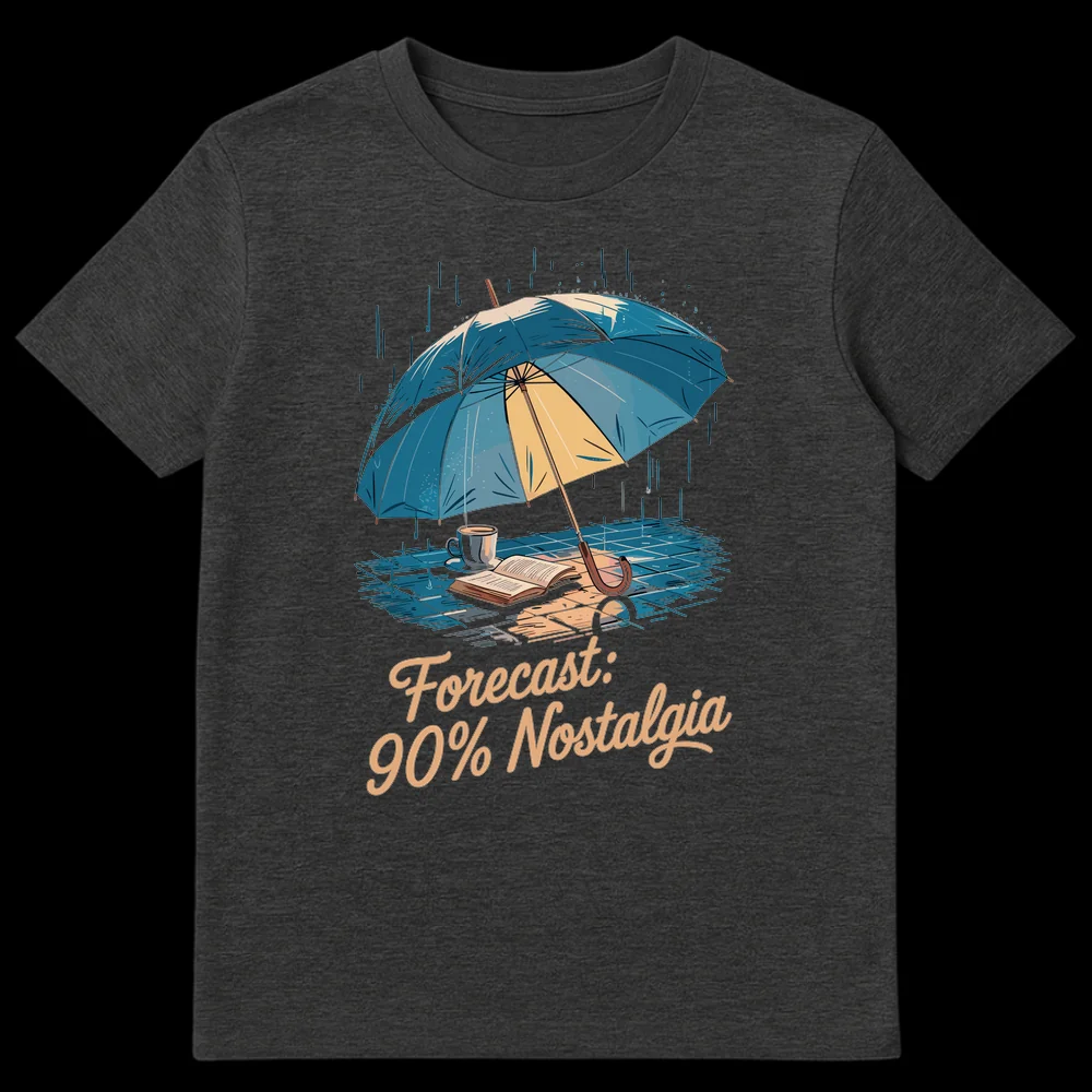 Embrace comfort with the “Forecast: 90% Nostalgia” t-shirt, featuring a serene rainy day scene under an umbrella with a book and coffee. This design cleverly reinterprets a weather forecast as a mood forecast, perfect for those who find joy in quiet moments and sentimental reflection. An ideal gift for book lovers, introverts, and anyone who cherishes cozy vibes.