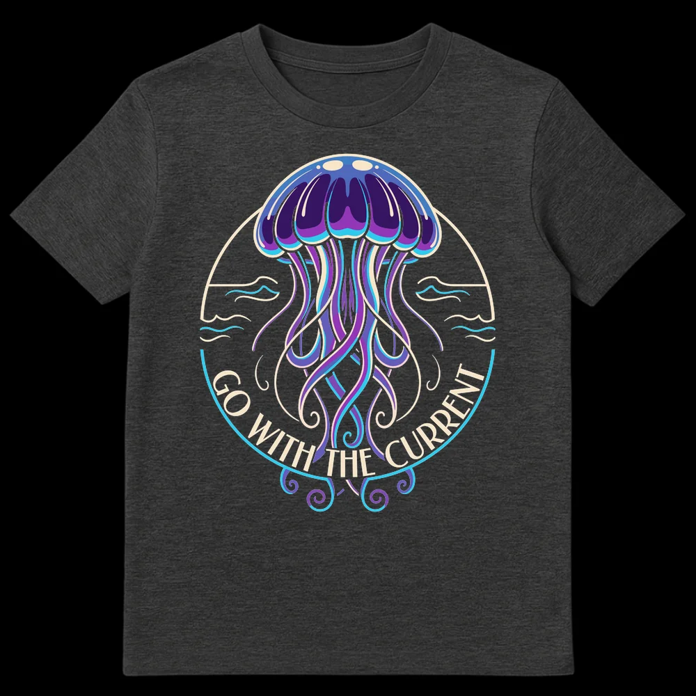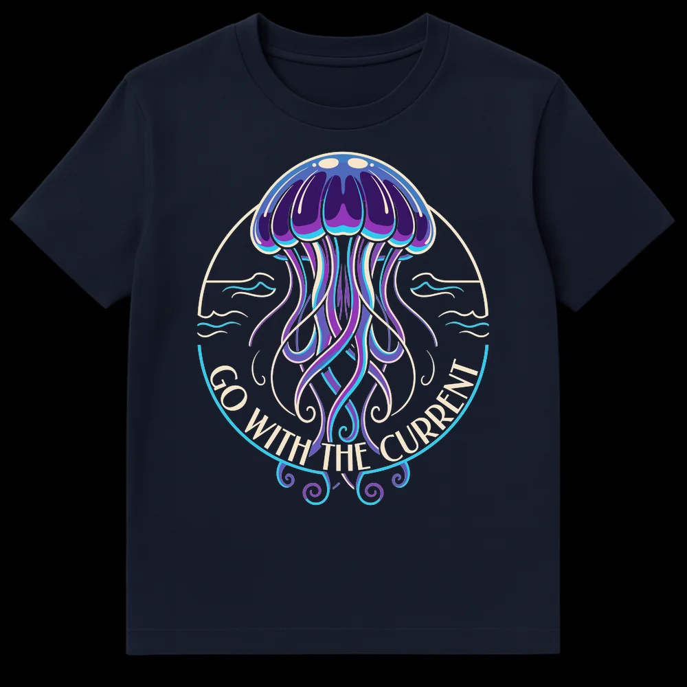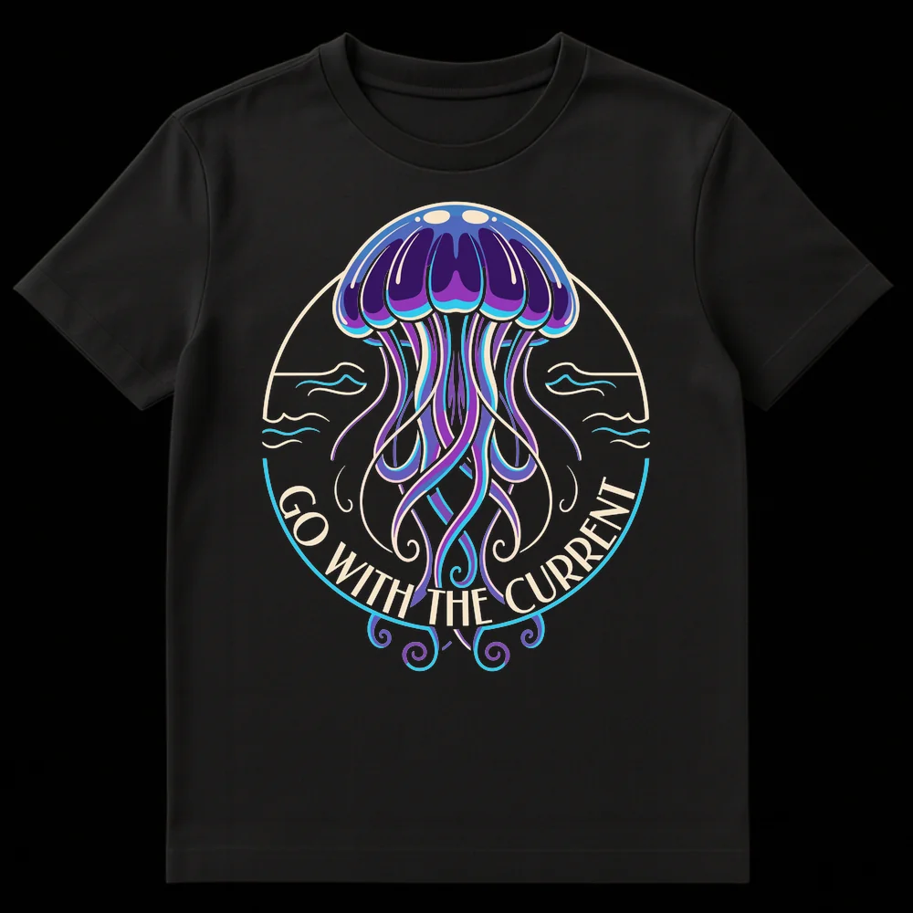 Embrace a chill vibe with our ‘Go With The Current’ t-shirt, featuring a stunning, bioluminescent-style jellyfish. This design is a clever visual pun, aligning the jellyfish’s natural drift with a positive, adaptable life philosophy. Perfect for ocean lovers, nature enthusiasts, or anyone who appreciates subtle humor and unique graphic tees.