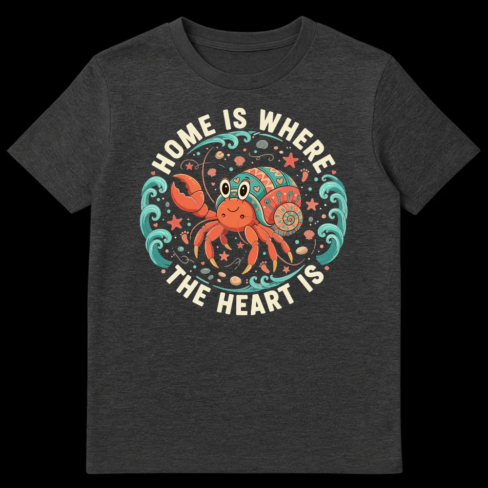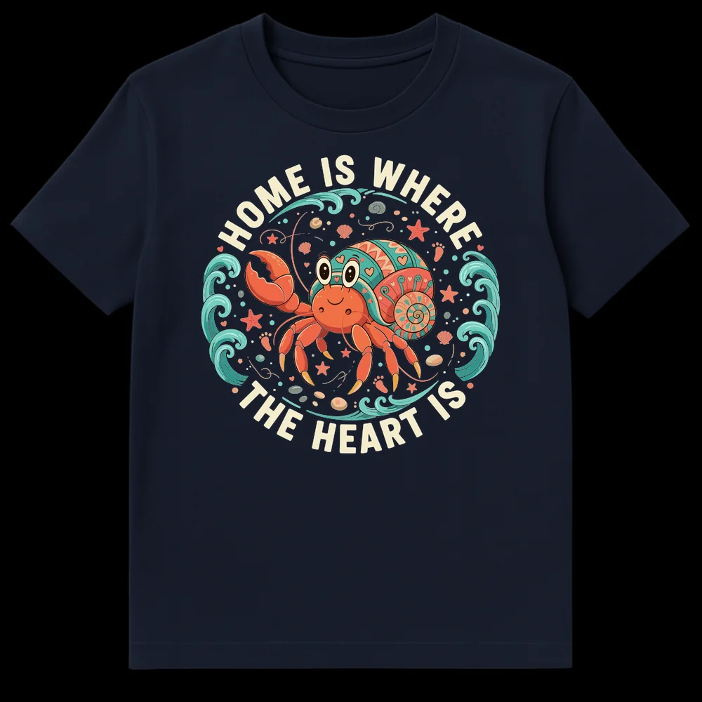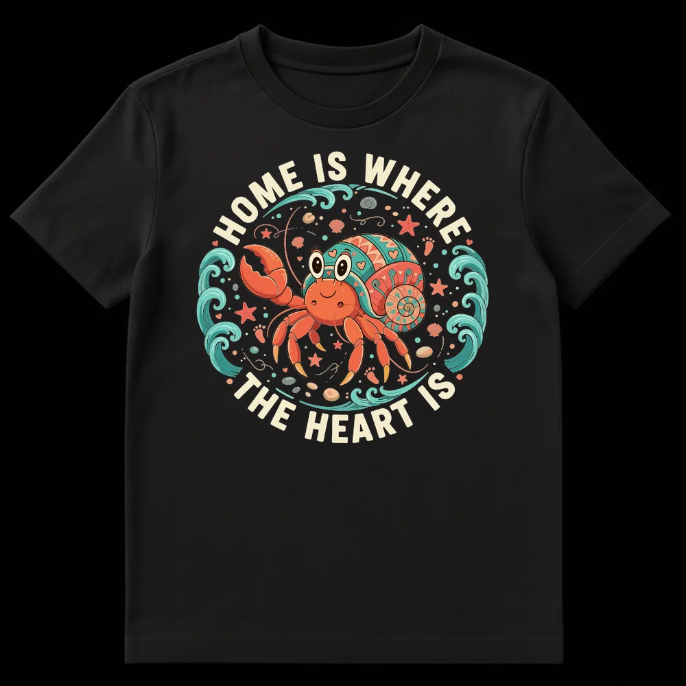 Embrace the heartwarming sentiment of ‘Home Is Where The Heart Is’ with this delightful t-shirt design. Our exclusive graphic showcases a cheerful, anthropomorphized hermit crab proudly carrying its intricately decorated shell, symbolizing that true home is found wherever love resides. The whimsical cartoon style, vibrant color palette of coral, teal, and dusty rose, and charming ocean elements like waves and starfish create an uplifting and endearing aesthetic. This shirt isn’t just a garment; it’s a playful ode to comfort, belonging, and the unique connection a hermit crab has to its portable abode. It’s an ideal gift for children, young adults, families, beach enthusiasts, animal lovers, or anyone who appreciates a sweet, clever pun and the simple joy of home. Wear your heart on your shell (or your shirt!) and spread warmth and happiness wherever you go.