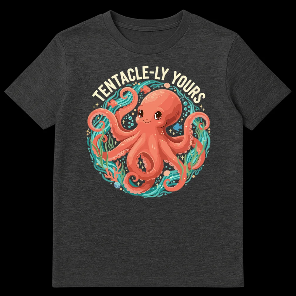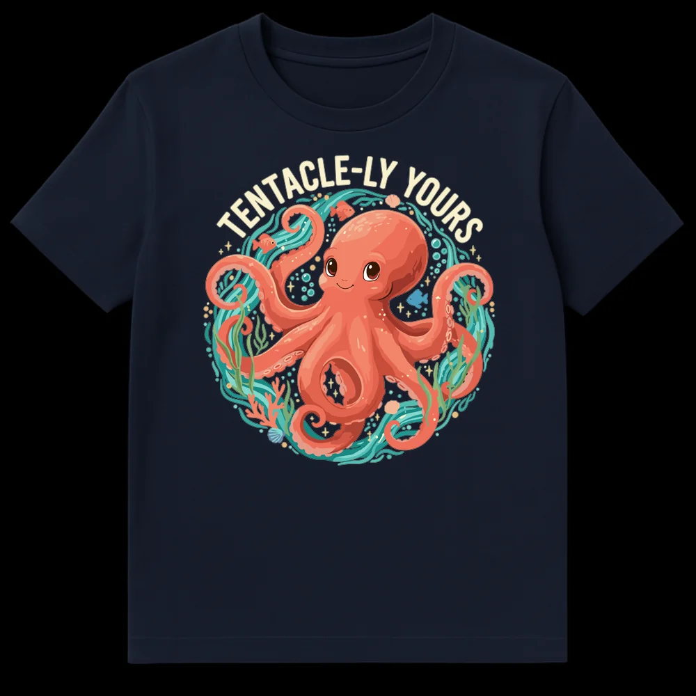 Dive into delightful humor with our “TENTACLE-LY YOURS” t-shirt, where an irresistibly cute, cartoon octopus extends a heartfelt, pun-filled greeting. This enchanting design takes the classic sign-off “Sincerely Yours” and transforms it into a charming, cephalopod-inspired declaration of affection. The friendly octopus, rendered in a whimsical, contemporary cartoon style with soft coral pinks and surrounded by a lush teal and green underwater world, brings a smile to any face. From vibrant coral to playful fish and shimmering bubbles, every detail radiates joy. This tee is more than just clothing; it’s a wearable expression of love, whimsy, and a passion for marine creatures. It makes an ideal gift for Valentine’s Day, anniversaries, birthdays, or just because, charming anyone who adores ocean life, clever wordplay, or unique, heartwarming designs.