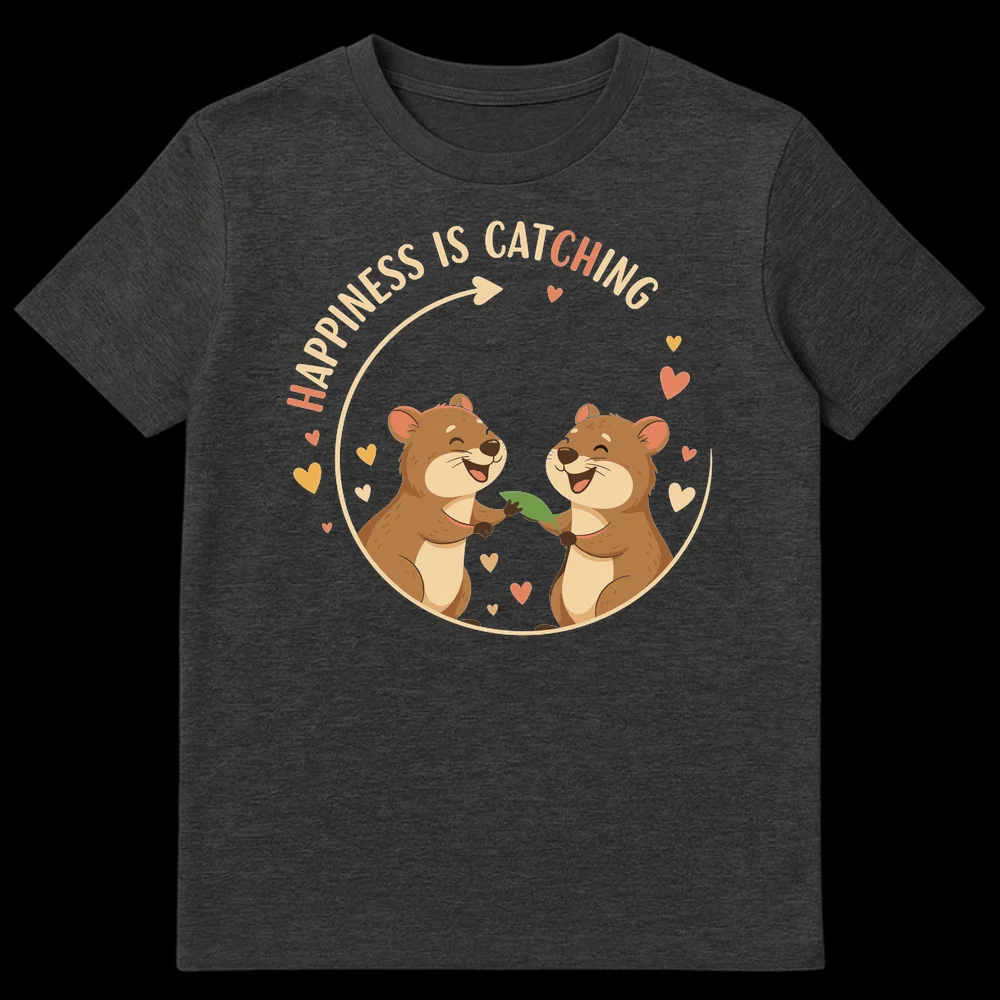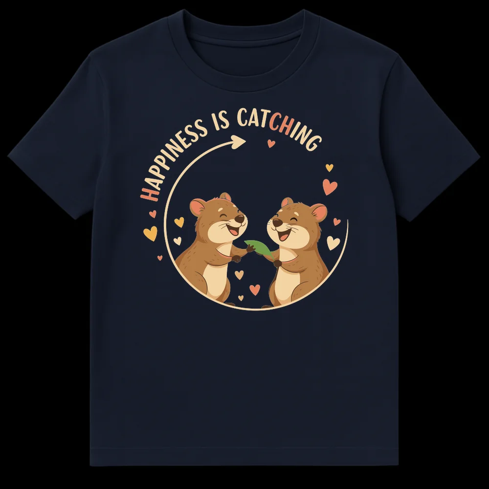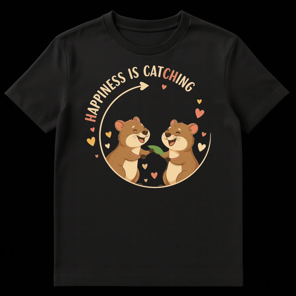 Embrace the warmth of shared joy with our “Happiness Is Catching” t-shirt! This delightful design features two charming, anthropomorphic marmots, eyes closed in pure bliss, as one passes a vibrant green leaf to the other. The phrase ‘Happiness Is Catching’ takes on a literal and heartwarming meaning here, visually reinforcing how good feelings spread through simple acts of sharing. Crafted with a modern cartoon style and a comforting pastel palette, it’s a perfect blend of cuteness and clever humor. Ideal for animal lovers, nature enthusiasts, or anyone who believes in spreading positivity, this tee makes a fantastic gift for friends, family, or as a treat for yourself to inspire a smile.