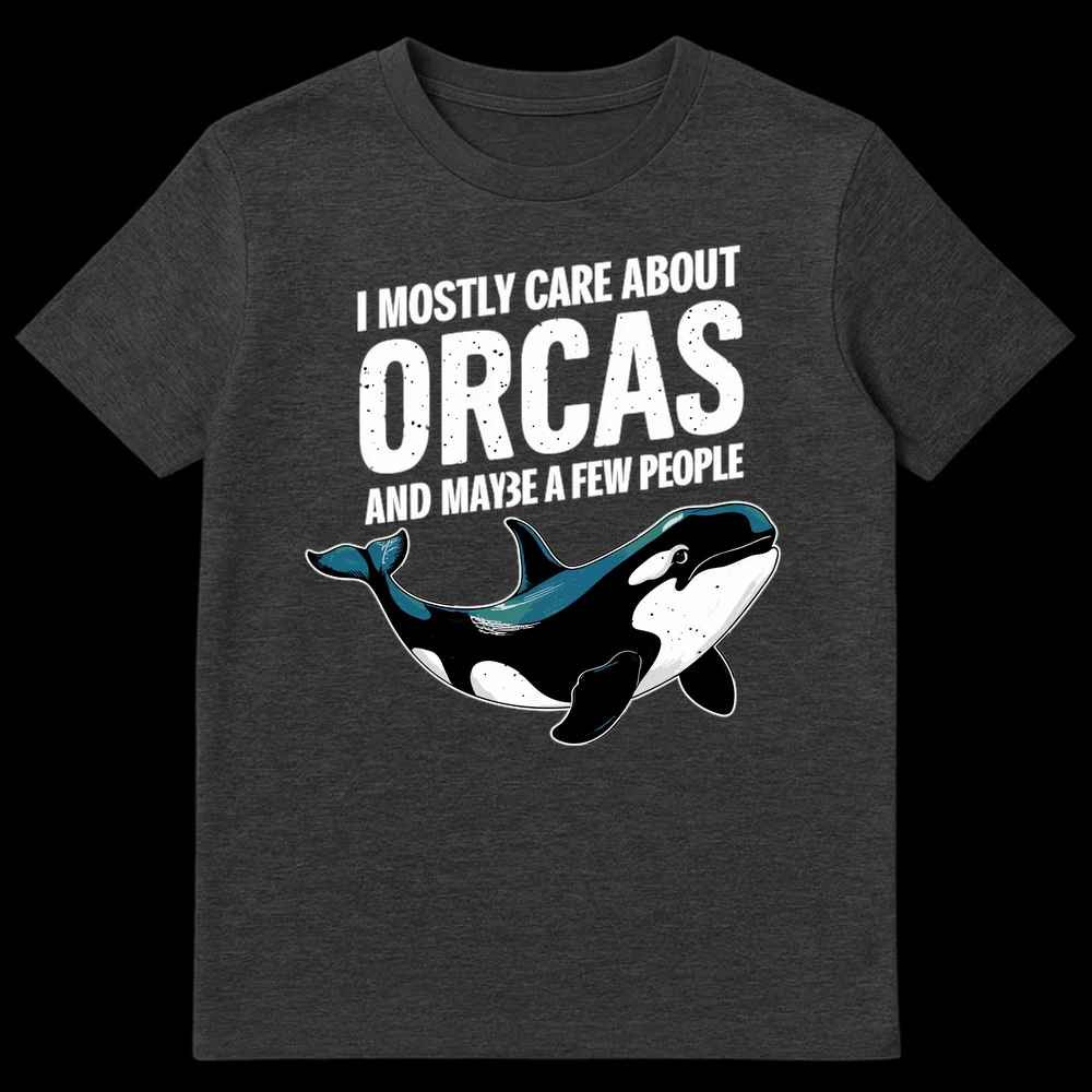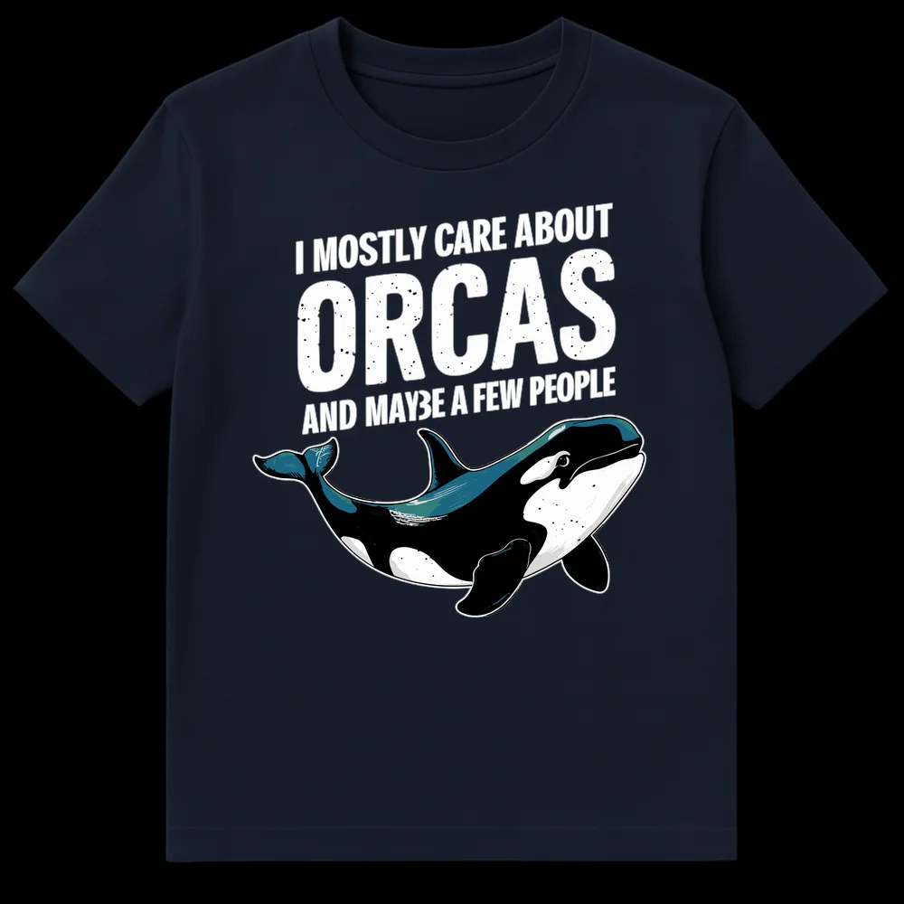 Express your unique personality with this “I Mostly Care About Orcas And Maybe A Few People” t-shirt. Featuring bold, distressed text and a vibrant orca illustration, this design perfectly captures the sentiment of marine life lovers and introverts with a dry sense of humor. It’s an ideal gift for anyone who prioritizes ocean friends over human crowds.
