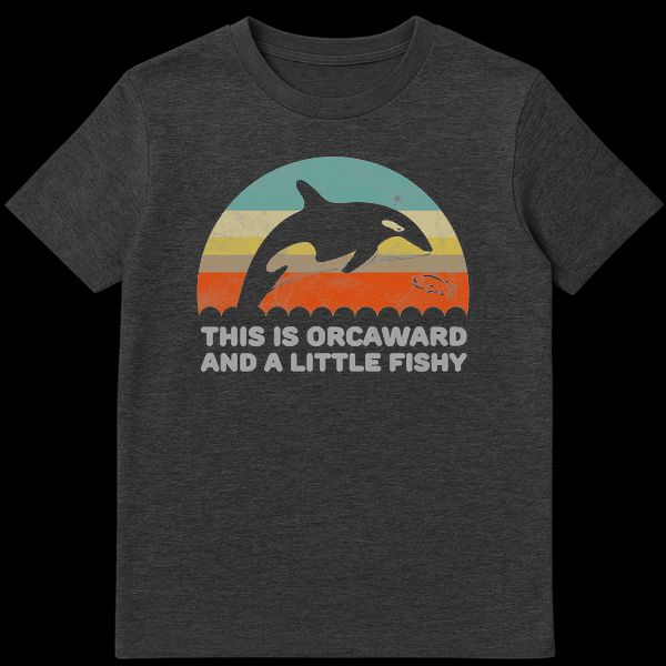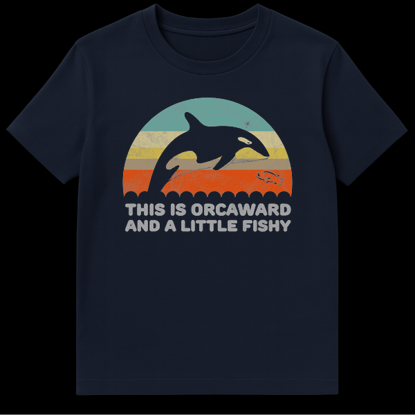 Dive into humor with our “THIS IS ORCAWARD AND A LITTLE FISHY” t-shirt, perfect for marine life enthusiasts. This design features a majestic orca leaping over colorful ocean stripes alongside a detailed fish, celebrating a playful pun. It’s an ideal gift for anyone who loves ocean creatures and a good laugh.