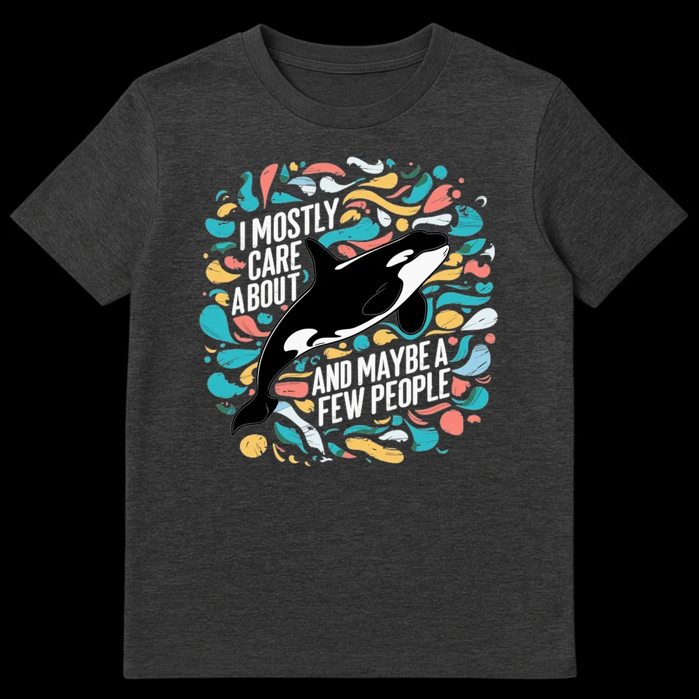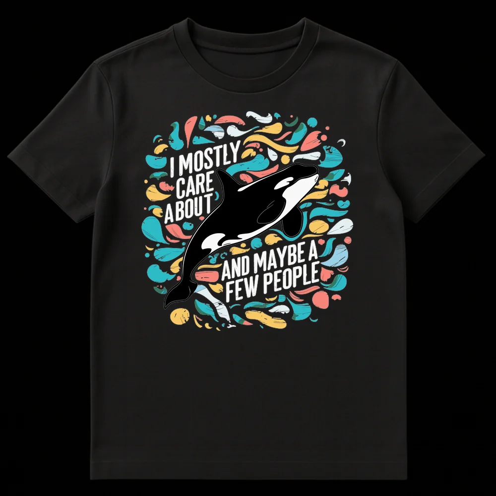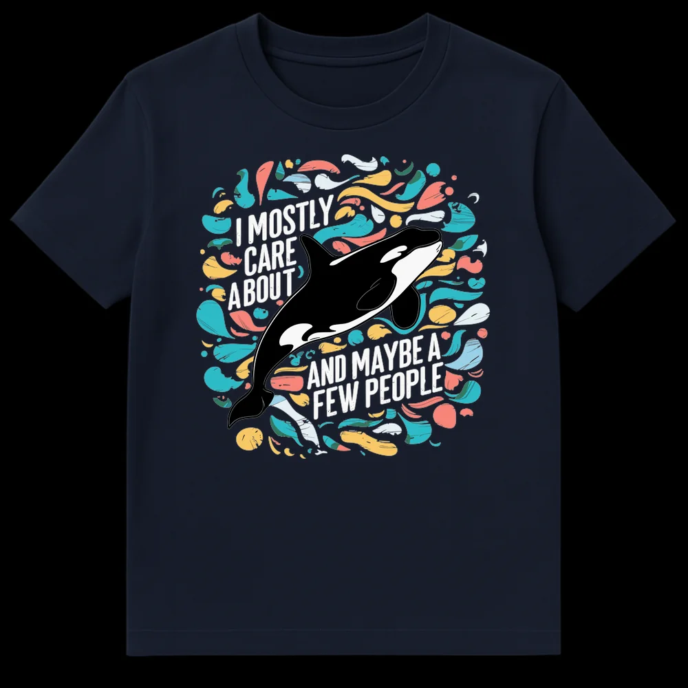 Express your unique priorities with this funny orca shirt! Featuring a bold graphic of a killer whale and the witty phrase “I MOSTLY CARE ABOUT [Orca] AND MAYBE A FEW PEOPLE,” this design speaks to animal enthusiasts with a sarcastic streak. It’s the perfect gift for marine life fans or anyone who loves their animal companions more than social gatherings.