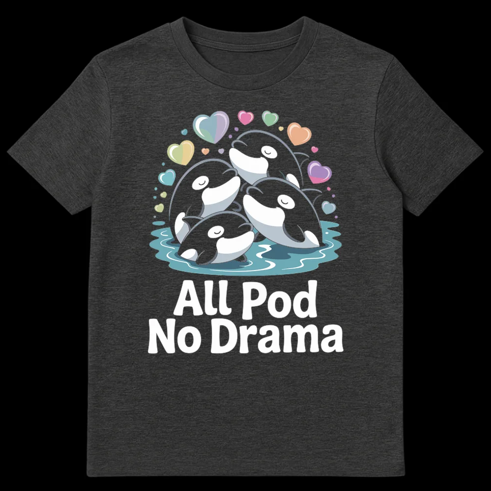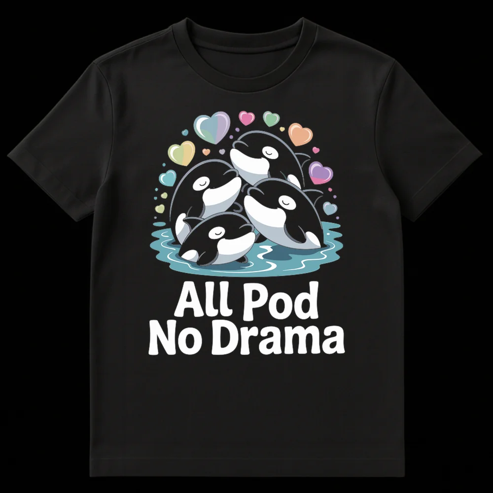 Embrace tranquility and spread smiles with our enchanting “All Pod No Drama” t-shirt. This delightful design showcases four charming, cartoon-style orcas in a serene underwater scene, surrounded by an array of soft pastel hearts and bubbles that enhance its cute, whimsical aesthetic. The clever slogan “All Pod No Drama” is a heartwarming pun, playing on the collective noun for whales to represent a supportive, harmonious group devoid of conflict and stress. It’s more than just a shirt; it’s a wearable reminder to cultivate peaceful relationships and a positive outlook. Crafted for comfort, this tee is a wonderful gift for marine life lovers, anyone who adores cute animal designs, or those dedicated to a drama-free lifestyle. Share the message of unity and calm with this unique and charming piece of apparel.