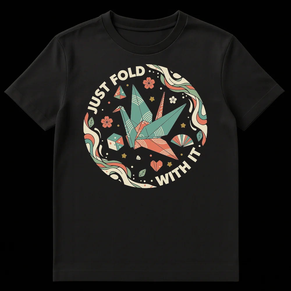 Embrace life’s twists and turns with our unique ‘JUST FOLD WITH IT’ t-shirt, a clever pun that invites a smile. This design transforms the well-known idiom into a celebration of patience and adaptability, inspired by the intricate art of origami. The centerpiece is a beautifully stylized origami crane, a symbol of hope and longevity, surrounded by charming smaller paper figures and delicate cherry blossoms, all rendered in a modern flat illustration style with a distinct Japanese ukiyo-e influence. The muted, earthy color palette of teal, coral, and cream on a deep black background creates a serene and harmonious aesthetic. It’s more than just a shirt; it’s a wearable reminder to stay calm and go with the flow. This t-shirt makes an exceptional gift for origami enthusiasts, crafters, lovers of Japanese culture, or anyone who appreciates subtle wordplay and calm, aesthetically pleasing designs. Perfect for those who find joy in meticulous art and a lighthearted perspective.