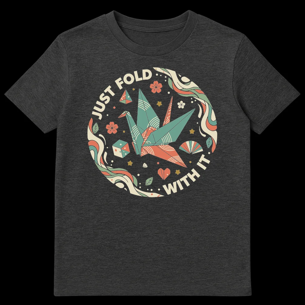 Embrace life’s folds with our ‘JUST FOLD WITH IT’ t-shirt, a clever pun on the popular idiom. Featuring a beautiful origami crane surrounded by delicate cherry blossoms and other paper crafts in a modern Japanese folk art style. This unique design blends serene aesthetics with witty humor, making it a perfect gift for origami lovers, crafters, or anyone who appreciates a calm, flexible approach to life.