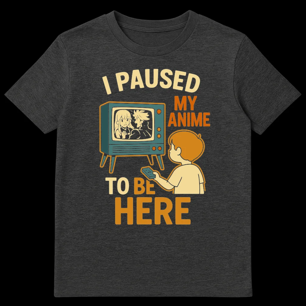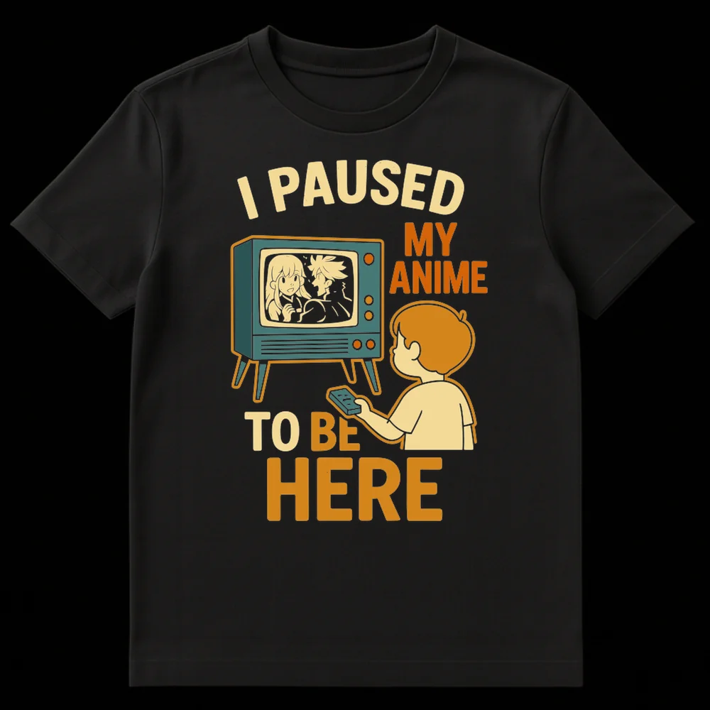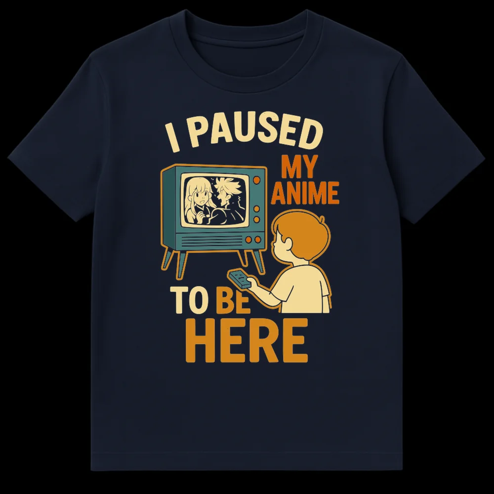 Celebrate your dedication to the screen with our “I Paused My Anime To Be HERE” t-shirt. This design hilariously captures the relatable struggle of anime fans, featuring a retro TV and stylized characters. It’s the perfect gift for any otaku, gamer, or binge-watcher who prioritizes their favorite shows.