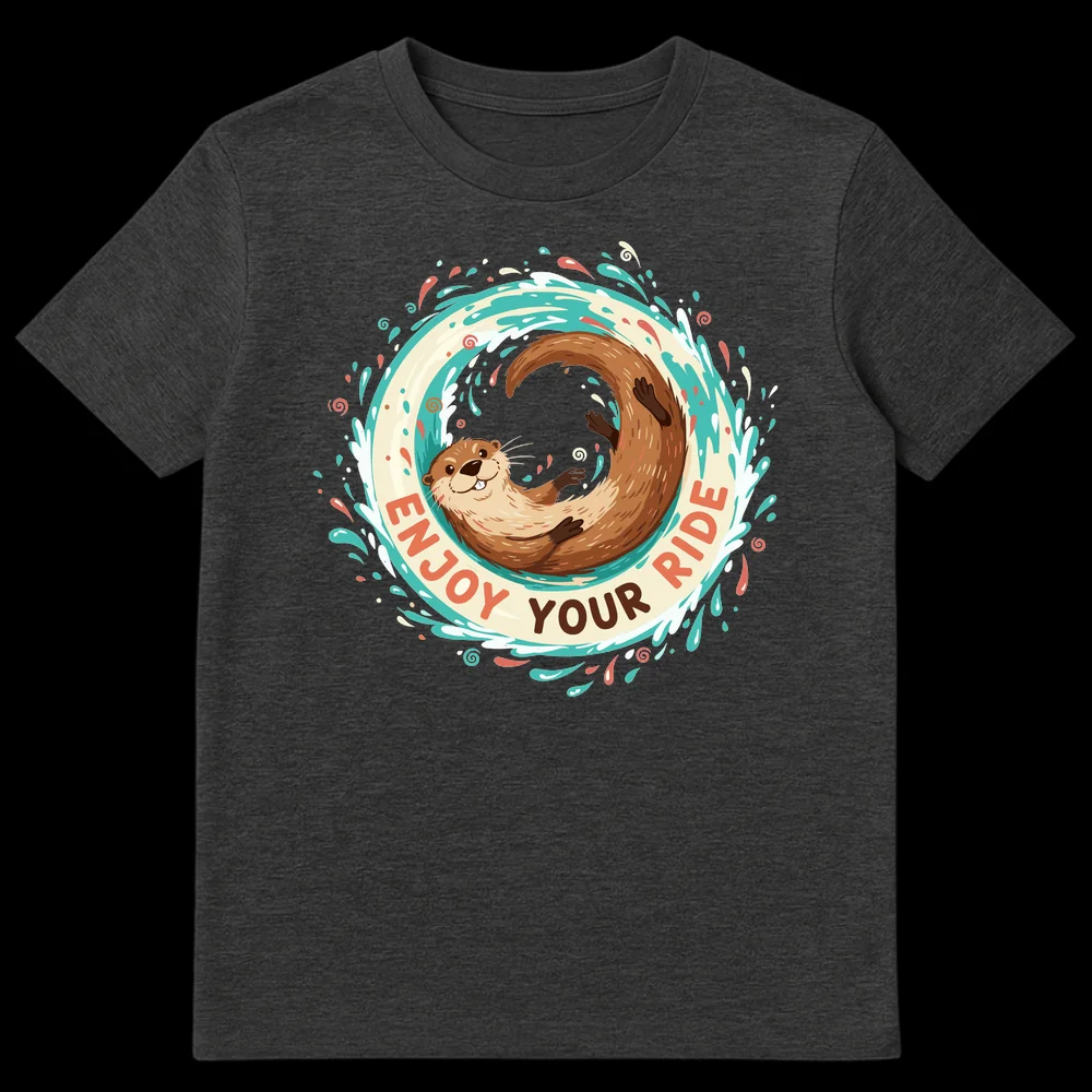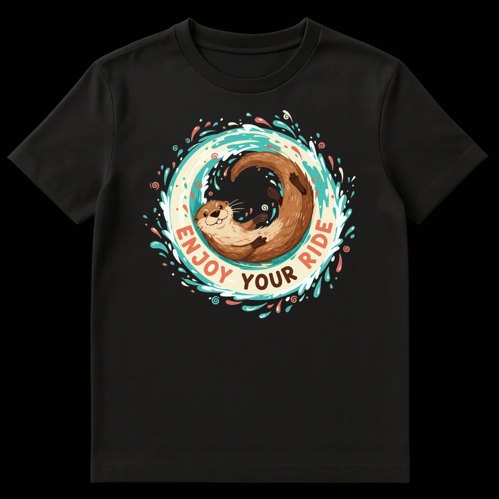 Splash into pure delight with our charming “Enjoy Your Ride” t-shirt! This unique design showcases a blissfully happy cartoon otter, smiling wide as it floats on its back amidst dynamic, swirling water. The phrase “ENJOY YOUR RIDE” is a clever and wholesome pun, celebrating the otter’s playful nature in water while also delivering a universal message of positivity and fun. Crafted in a vibrant, whimsical modern cartoon style with an appealing color palette, this shirt is a genuine mood booster. It’s an ideal gift for otter lovers, nature enthusiasts, or anyone who appreciates witty animal puns and cheerful apparel. Perfect for family outings, vacation wear, or simply adding a dose of joy to your everyday wardrobe. Encourage smiles and good times with this adorable, feel-good design!