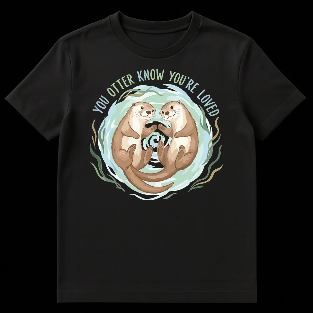 Celebrate love and laughter with our adorable “YOU OTTER KNOW YOU’RE LOVED” t-shirt. This design features two charming otters holding paws, beautifully illustrating the heartwarming pun. It’s a sweet, wholesome way to remind someone special they are cherished, making it a perfect gift for animal lovers, partners, or friends who appreciate a good pun.