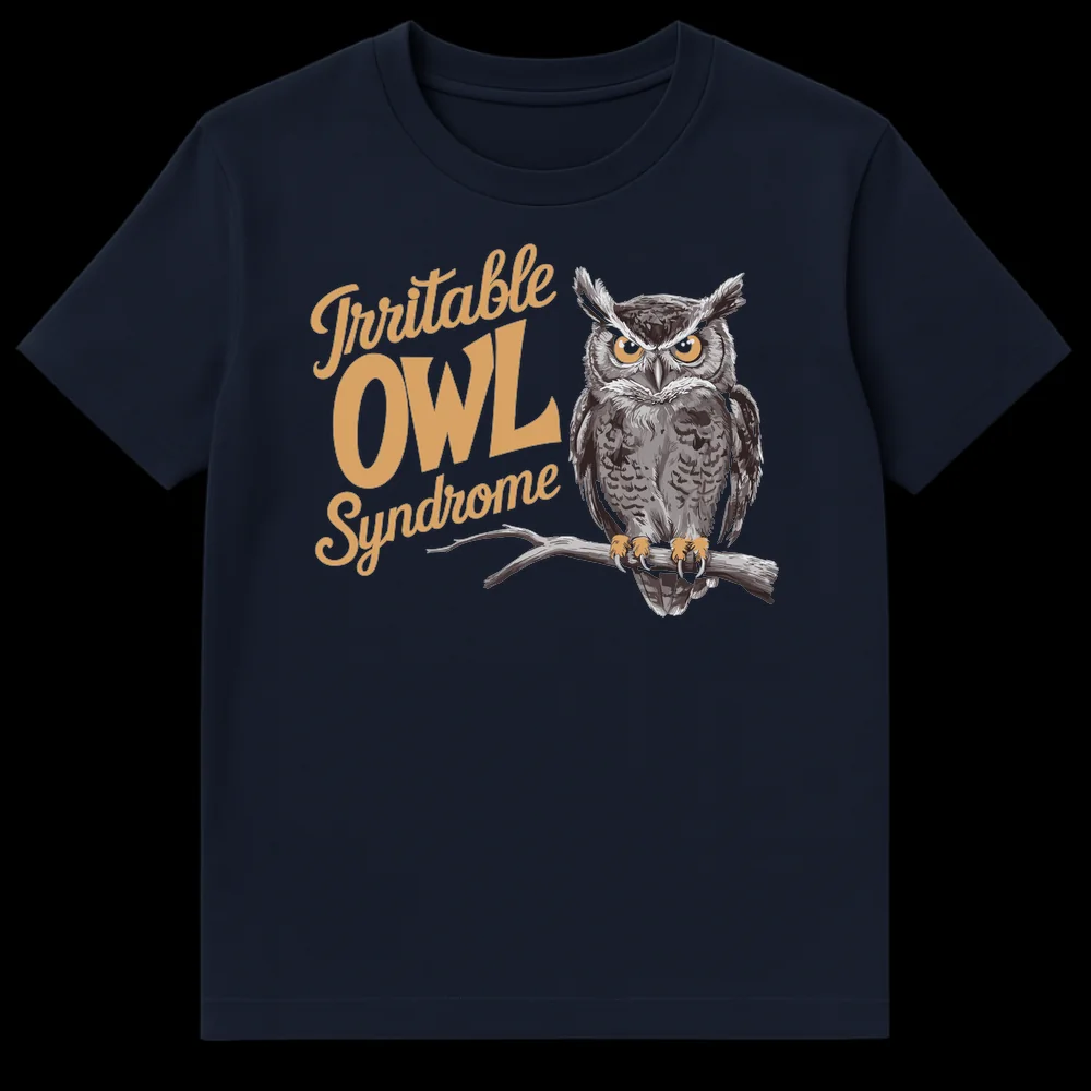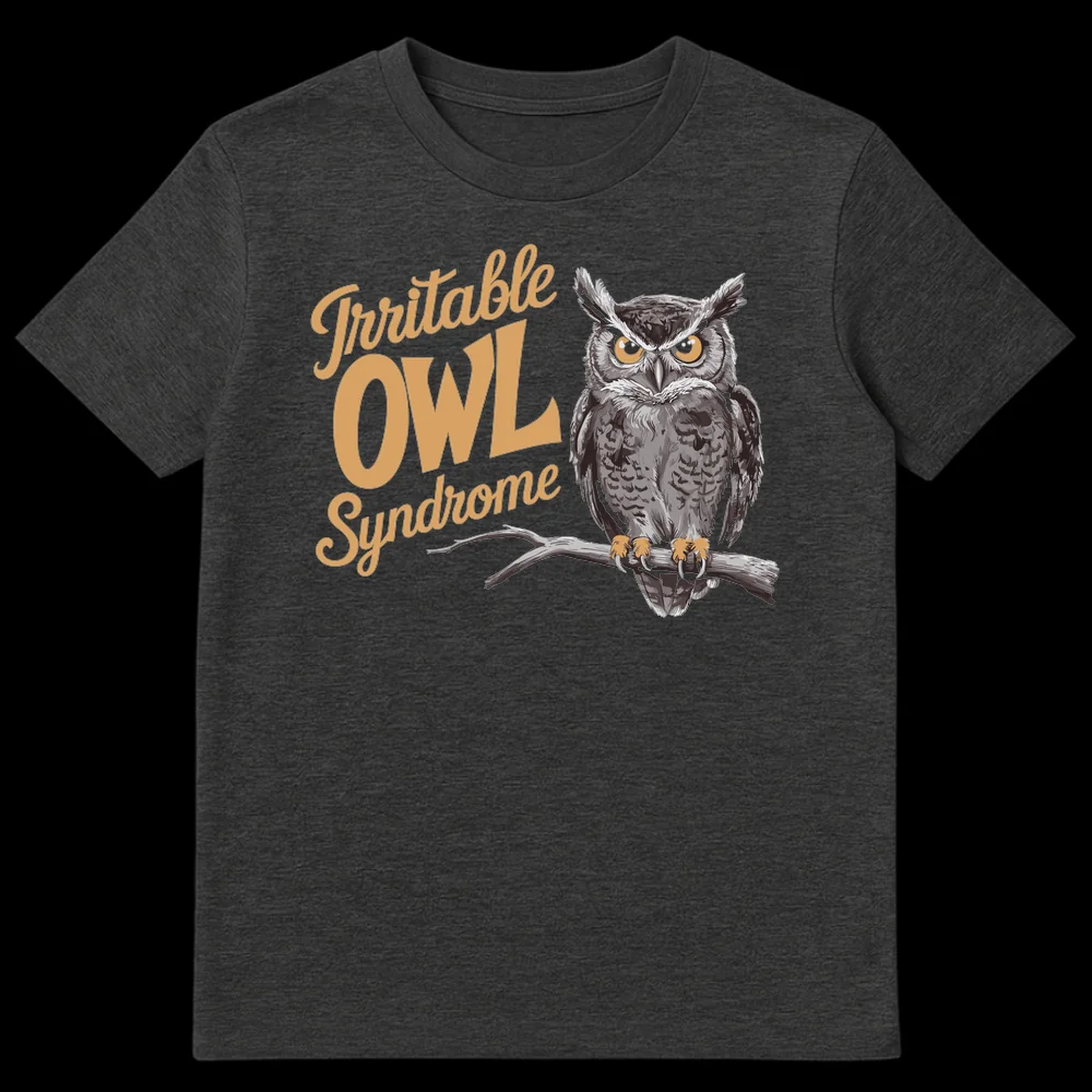 Unleash your charmingly irritable side with our exclusive “Irritable OWL Syndrome” t-shirt. This isn’t just a shirt; it’s a humorous declaration for anyone who’s a true night owl or perpetually grumpy before their first cup of coffee. The design showcases a highly detailed, realistically rendered Great Horned Owl, its expression a masterpiece of relatable grumpiness, perfectly embodying the “irritable” aspect of the clever pun. This witty wordplay on “Irritable Bowel Syndrome” makes for an instant conversation starter and a guaranteed chuckle. It’s the perfect sarcastic owl tee for those with a dry sense of humor, an animal lover, or anyone who enjoys unique, humorous gifts. Crafted for comfort, this bird pun clothing celebrates both your love for owls and your relatable lack of morning enthusiasm. Surprise a friend, family member, or colleague who truly understands the struggle of being a magnificent, yet moody, creature of the night.