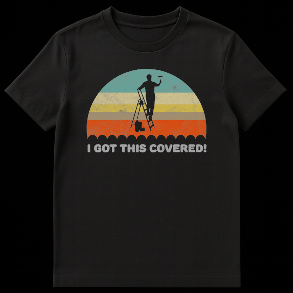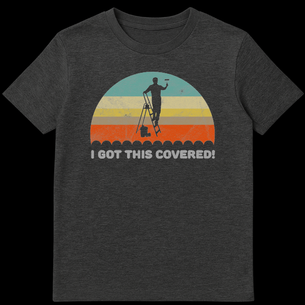 Declare your confidence with this unique t-shirt featuring a black silhouette of a painter on a ladder, actively rolling paint. The phrase “I GOT THIS COVERED!” in distressed light gray font perfectly captures a can-do attitude for any home improvement project. This design combines a retro-inspired striped semi-circle background with a bold statement, making it a great gift for painters, DIY enthusiasts, or anyone tackling a new challenge.