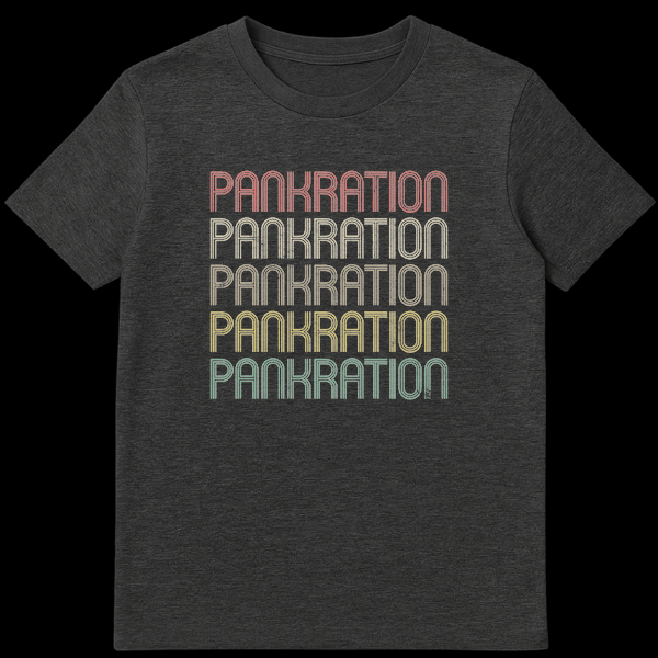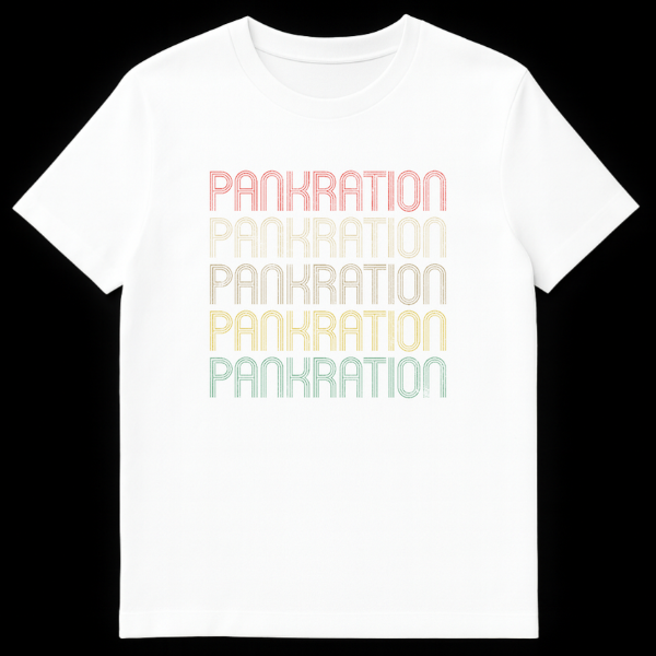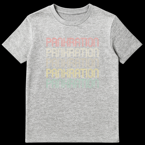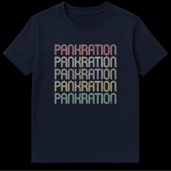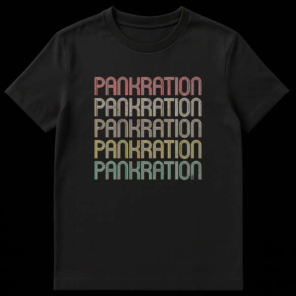 Journey back to the Ancient Olympic Games with our exclusive Pankration t-shirt, celebrating the formidable Greek combat sport that combined boxing and wrestling. This design showcases the word ‘PANKRATION’ five times in a captivating retro typography, featuring a unique stacked-line font with a subtle distressed texture. The text transitions through a warm, muted gradient of reddish-pink, tan, golden yellow, olive green, and teal against a classic black background, evoking a timeless vintage aesthetic.