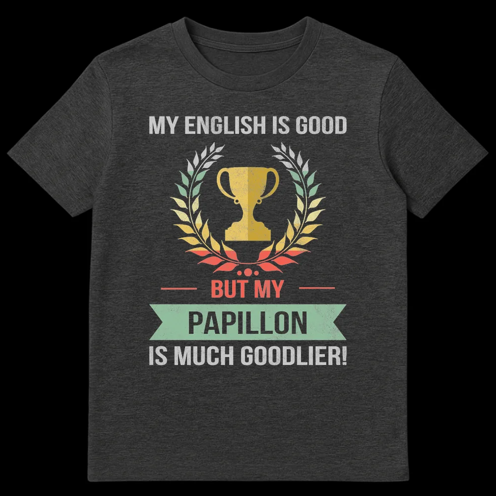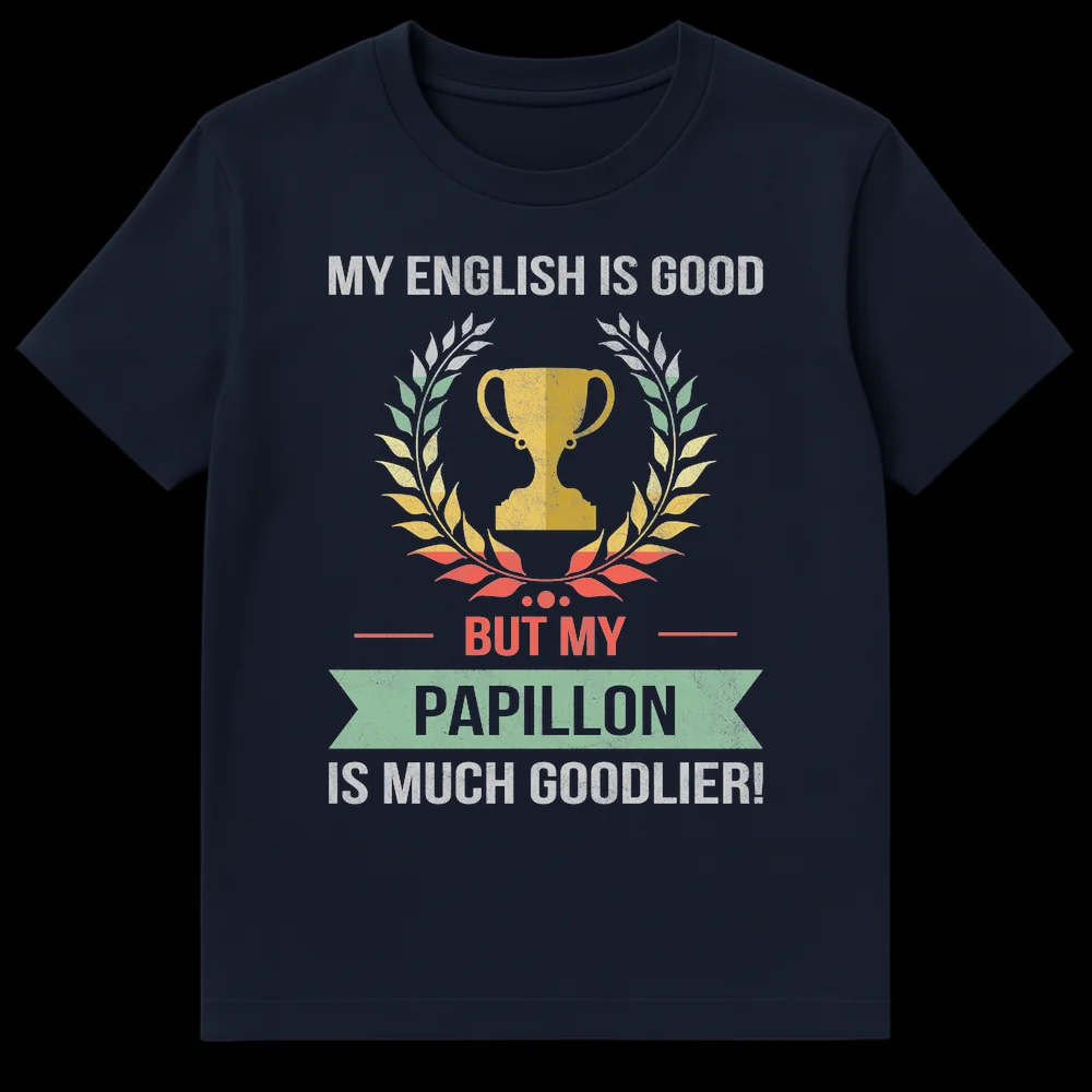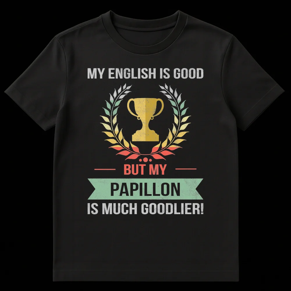 Showcase your devotion to your delightful Papillon with this unique, vintage-inspired t-shirt. The design brilliantly combines self-deprecating humor with overflowing pet pride, stating “MY ENGLISH IS GOOD BUT MY PAPILLON IS MUCH GOODLIER!”. The intentionally quirky use of “goodlier” highlights the irresistible, above-all-else cuteness of your Papillon, resonating with every dog lover’s heart. Adorned with a distressed trophy graphic, it humorously celebrates your furry companion’s ‘winning’ qualities. This tee is an ideal gift for Papillon dog owners, enthusiasts, or anyone who appreciates a clever, lighthearted pet-themed pun and a classic retro aesthetic.
