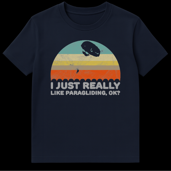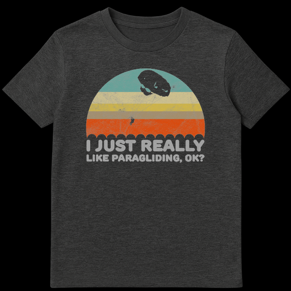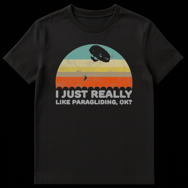 Show off your passion with our “I JUST REALLY LIKE PARAGLIDING, OK?” T-shirt, designed for every devoted paraglider. This shirt captures the essence of deep hobby devotion with a touch of humor, perfect for those who’ve had to explain their intense love for the sport. The retro-inspired design features a minimalist paraglider silhouette soaring over a beautifully distressed, vintage-color sunset emblem, all set against a classic black tee. It’s a statement piece that resonates with the adventurous spirit and camaraderie of the paragliding community. A fantastic paragliding gift for anyone who dreams of flight, from seasoned pilots to aspiring adventurers, or just someone who really, really likes paragliding.