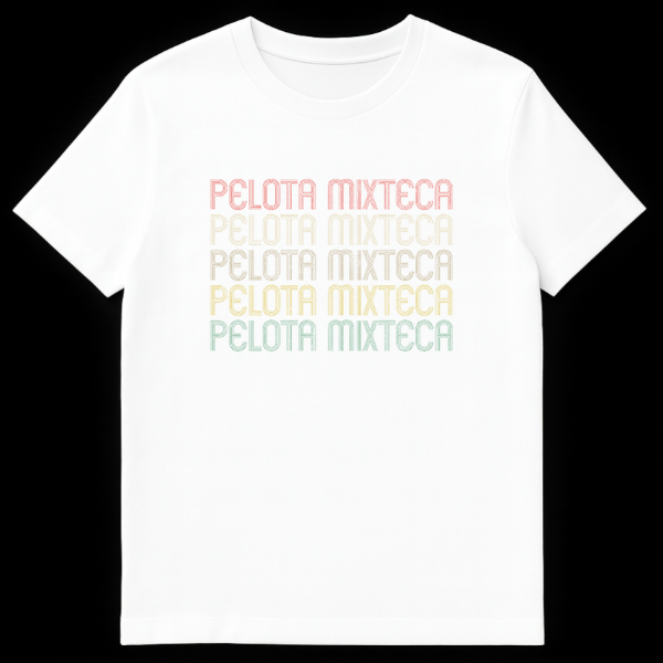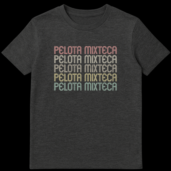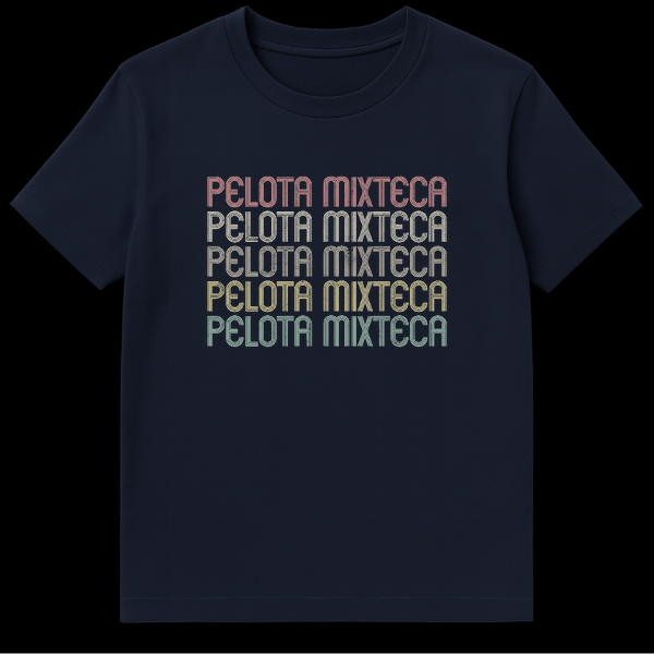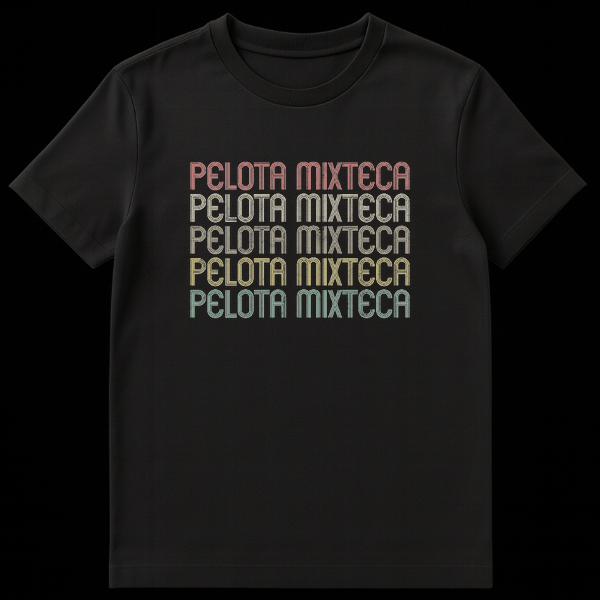 Embrace the spirit of a timeless sport with our Pelota Mixteca T-Shirt. This distinctive design proudly displays “PELOTA MIXTECA” five times, rendered in a captivating retro-vintage typography that commands attention. Each letter is crafted with multi-parallel lines and a slightly distressed texture, reminiscent of classic 70s and 80s athletic wear. The warm, sequential color gradient against a dark background beautifully captures the essence of heritage and tradition. This shirt is more than just apparel; it’s a direct cultural reference and homage to the ancient Mesoamerican ballgame from Oaxaca, Mexico. Ideal for Pelota Mixteca enthusiasts, individuals of Mexican heritage expressing cultural pride, or anyone who appreciates unique designs with deep cultural roots. It’s a perfect way to celebrate history, identity, and the enduring legacy of traditional sports.