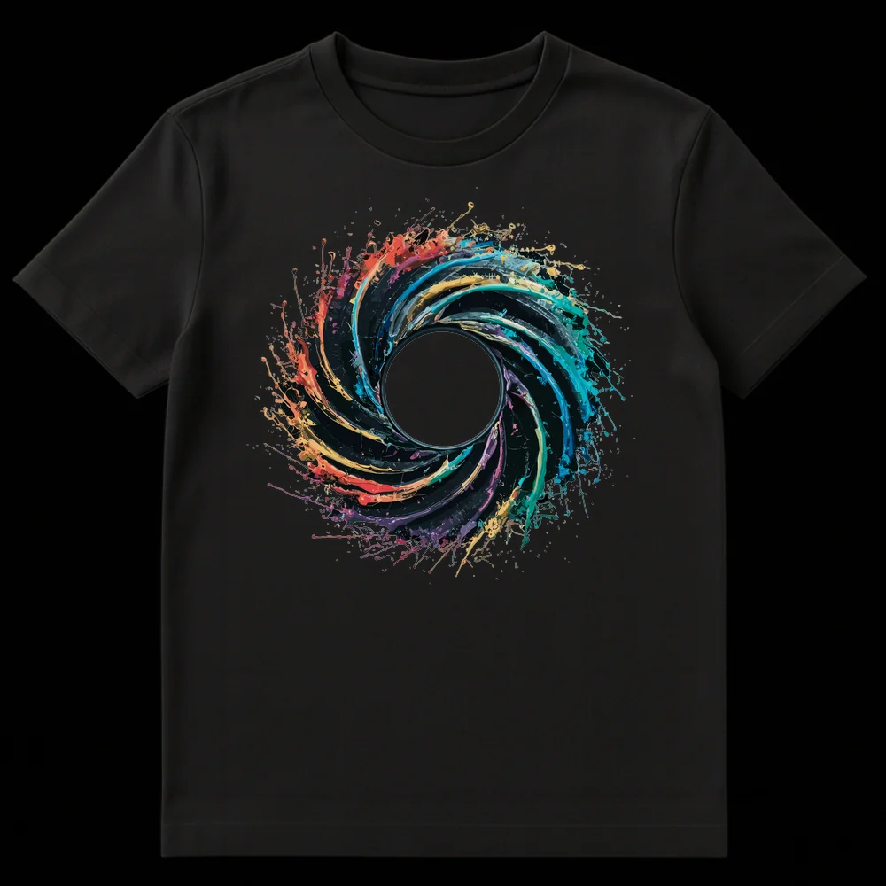 Unleash your creative spirit with our stunning Vibrant Lens Aperture Swirl Art T-Shirt. This design isn’t just clothing; it’s a wearable masterpiece, showcasing a breathtaking explosion of multi-colored liquid paint swirling around a mysterious dark void. The detailed, photorealistic splashes create an illusion of real movement and energy, reminiscent of a photographer’s lens capturing a burst of life or a cosmic black hole pulling in starlight. Against the deep black background, the full-spectrum rainbow colors truly pop, ensuring you stand out. This tee is a fantastic gift for photography enthusiasts, artists, science fiction fans, or anyone who loves abstract, eye-catching designs and wants to infuse their wardrobe with dynamic, modern style and a splash of personality. Express your passion for art and visual wonder.