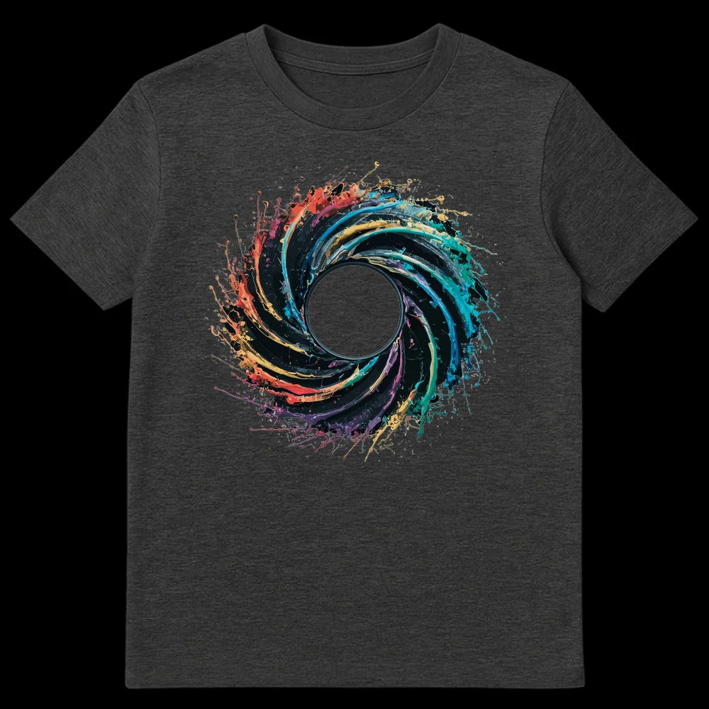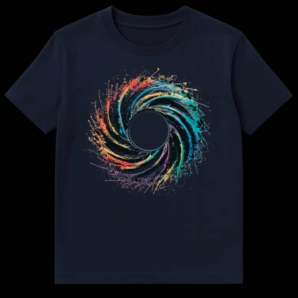 Dive into a world of color and creativity with this dynamic t-shirt, featuring a mesmerizing vortex of rainbow liquid paint splashing around a dark, central aperture. This unique design evokes the sophisticated look of a camera lens or the cosmic mystery of a black hole, making it a perfect statement piece. It’s an ideal gift for photography lovers, abstract art aficionados, or anyone who appreciates bold, vibrant visuals.