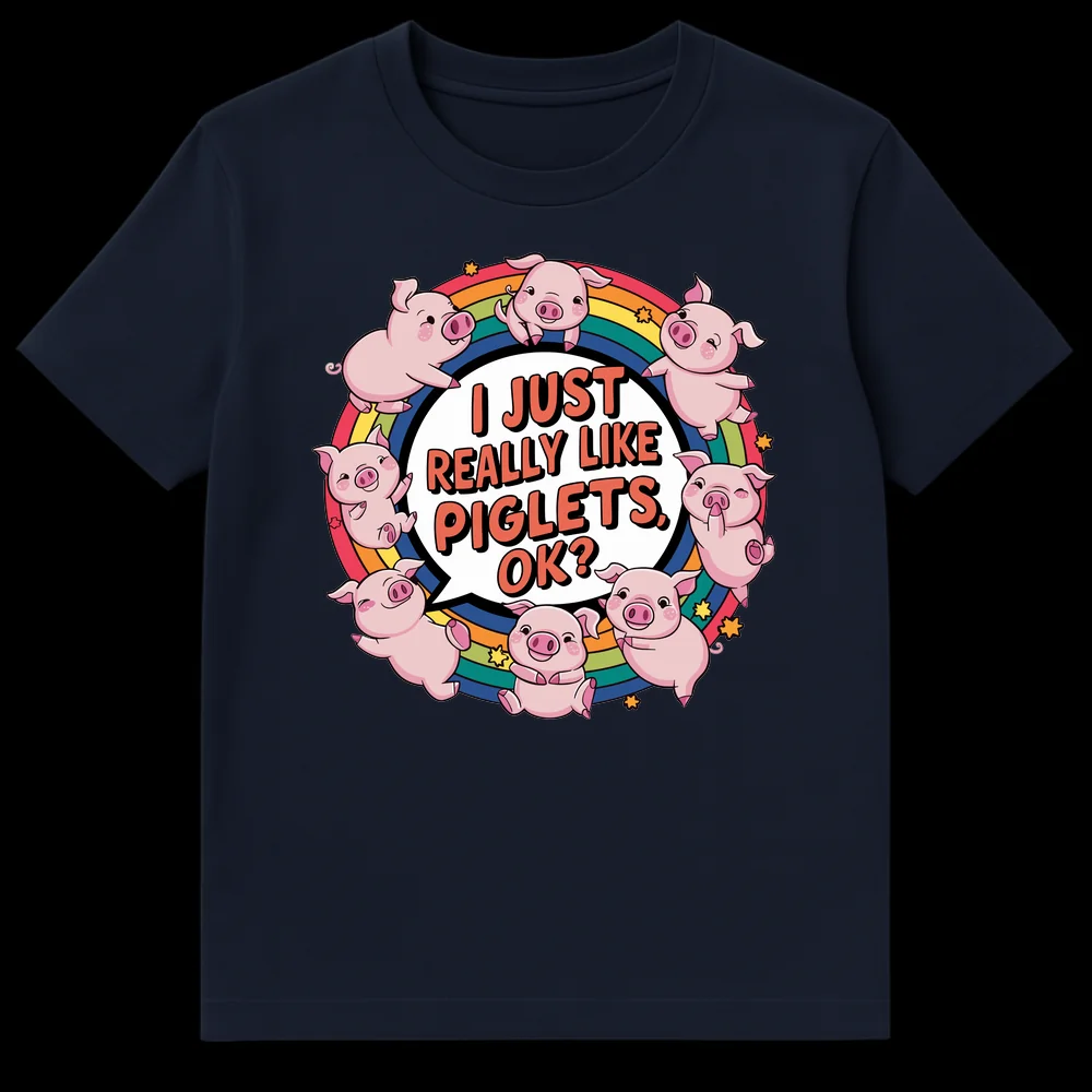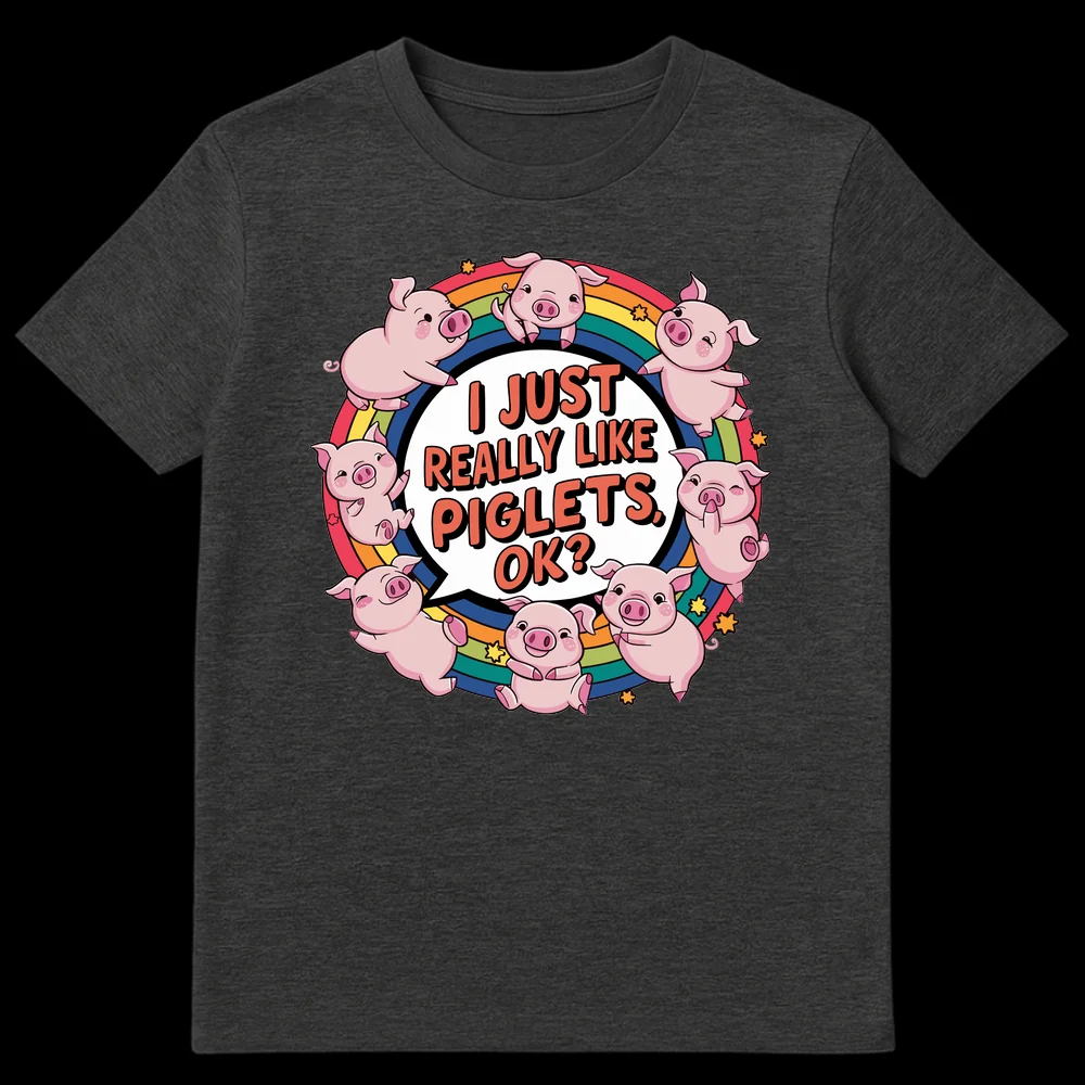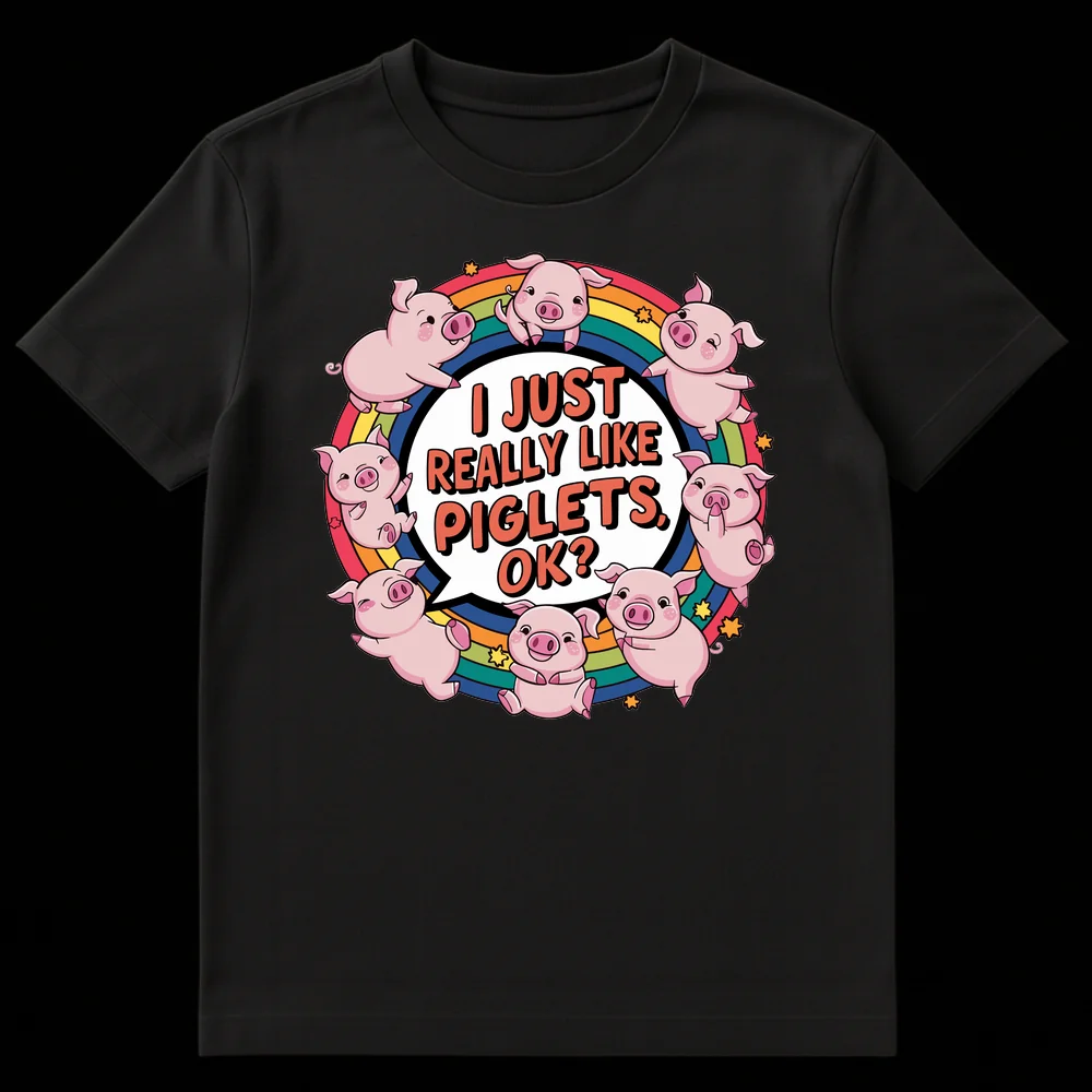 Embrace your inner animal lover with our irresistibly charming “I JUST REALLY LIKE PIGLETS, OK?” t-shirt. This delightful design captures pure, unadulterated affection for baby pigs, showcasing a group of nine whimsical piglets in various happy poses, soaring above a bright, multi-colored rainbow. The playful phrase in a speech bubble, accompanied by twinkling stars, adds a touch of lighthearted humor, making it clear there’s no need to justify your piglet passion! Crafted with a vibrant color palette against a deep black background, this top makes the perfect gift for pig enthusiasts, farm animal admirers, or anyone who cherishes cute and expressive animal-themed apparel.