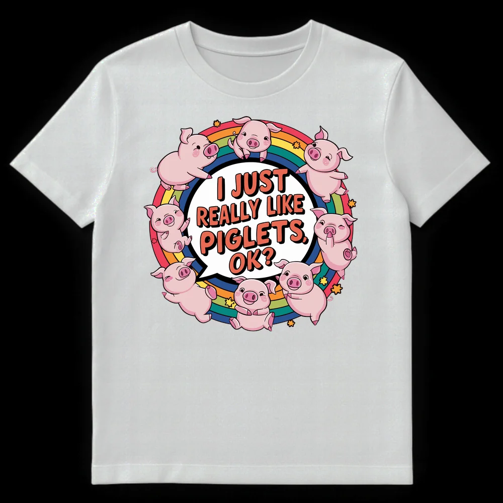 Declare your pure joy with our “I JUST REALLY LIKE PIGLETS, OK?” t-shirt. This design features an array of adorable, cartoon piglets frolicking across a vibrant rainbow, making a wholesome statement. It’s the perfect gift for anyone with an undeniable soft spot for baby pigs and cute animal apparel.