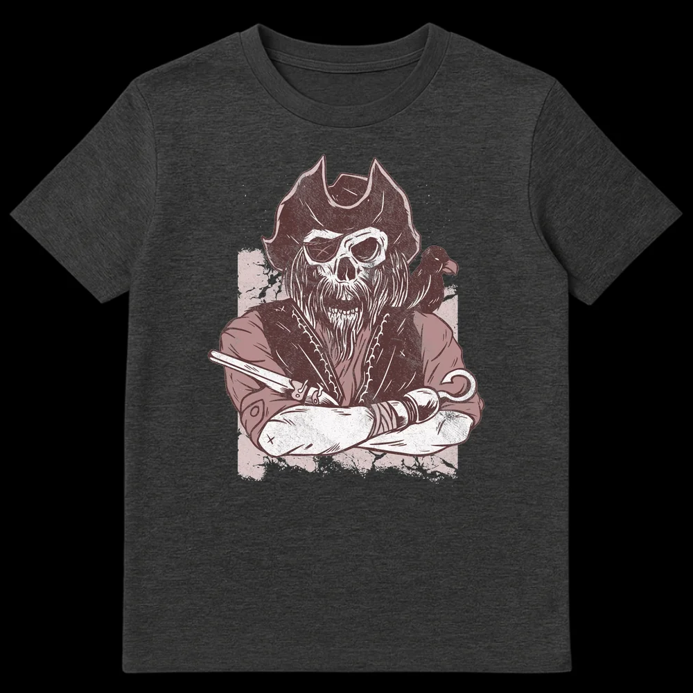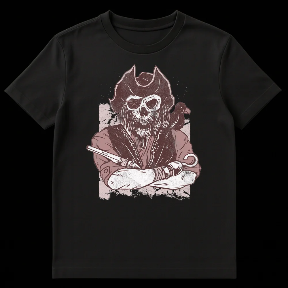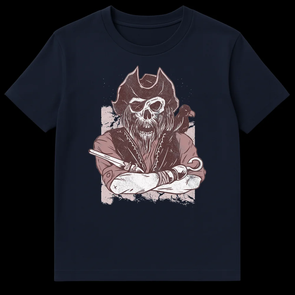 Embrace the macabre charm of the high seas with our Undead Pirate Skeleton t-shirt. This design features a gritty, vintage-style pirate skeleton complete with a tricorn hat, hook hand, flintlock pistol, and a watchful raven. It’s a striking blend of classic buccaneer lore and gothic aesthetics, perfect for fans of dark fantasy and swashbuckling adventures. A unique gift for any pirate enthusiast or lover of edgy, old-school designs.