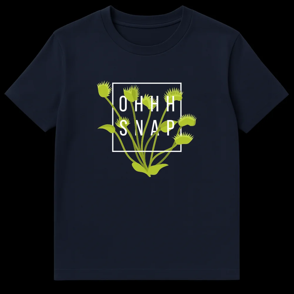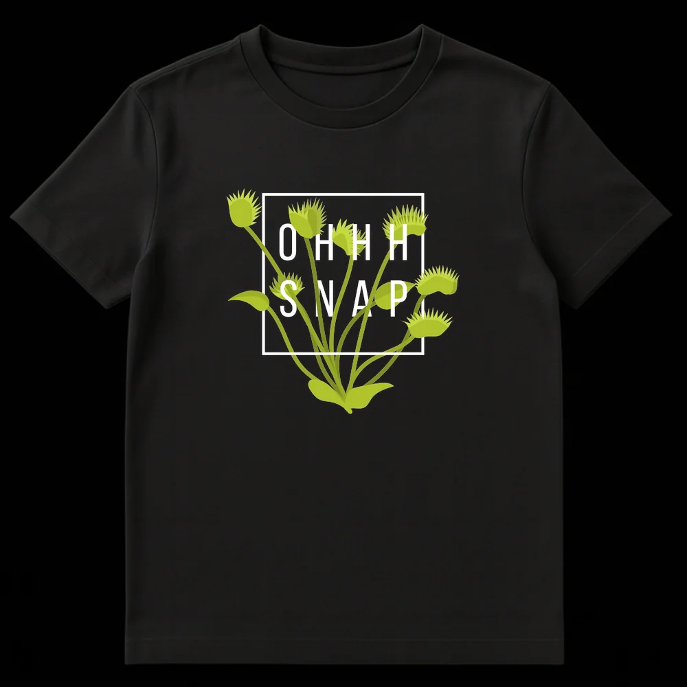 Unleash your witty side with our “OHH SNAP” Venus Flytrap t-shirt! This clever design features stylized carnivorous plants interacting with the phrase, creating a hilarious visual pun about their unique snapping action. Perfect for those who appreciate nature’s quirks and a smart sense of humor, it’s an ideal gift for gardeners, plant lovers, or anyone with a quick wit.