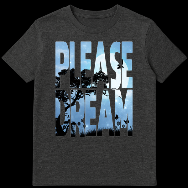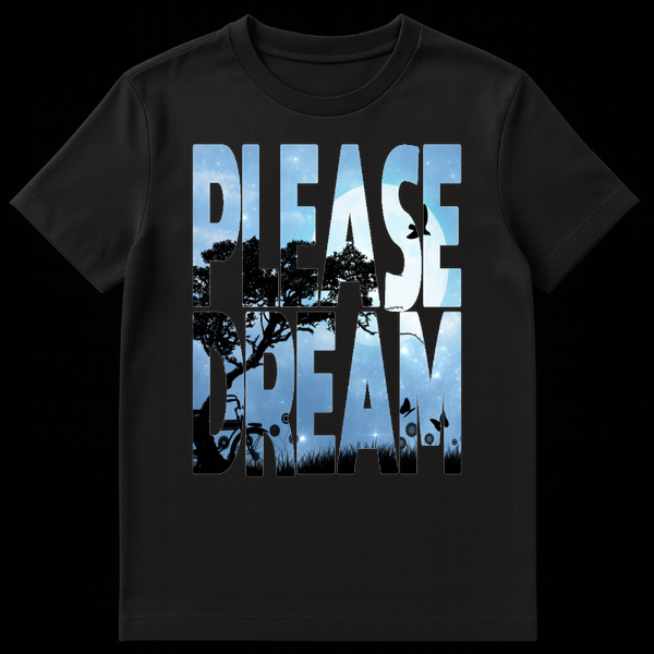 Drift away with this stunning ‘Please Dream’ graphic tee, featuring a mesmerizing double-exposure effect. The bold lettering reveals a serene nightscape complete with a glowing full moon, silhouetted trees, and a quiet bicycle resting in tall grass. Perfect for dreamers, nature lovers, and anyone who finds magic in the midnight hour.
