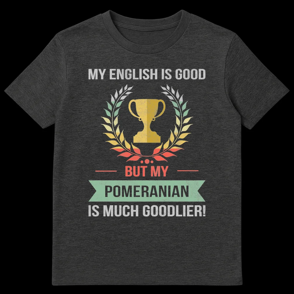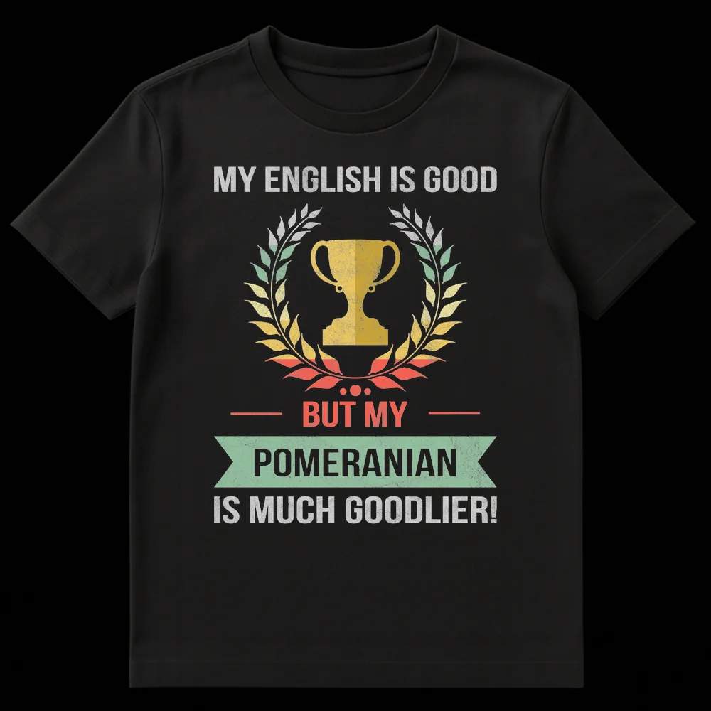 Showcase your unparalleled devotion to your Pomeranian with this unique, conversation-starting t-shirt. The design brilliantly combines a distressed, vintage aesthetic with a heartfelt, humorous declaration: “MY ENGLISH IS GOOD BUT MY POMERANIAN IS MUCH GOODLIER!” This playful twist on grammar perfectly captures the overwhelming pride and affection only a dog owner can understand, making light of linguistic rules in favor of canine adoration. A subtly rendered trophy and laurel wreath amplify the sentiment, crowning your beloved Pomeranian as truly “best in show” in your eyes. Crafted for comfort and style, this shirt is an ideal gift for Pomeranian enthusiasts, proud dog parents, or anyone who appreciates a clever, heartwarming pet-themed joke. Embrace your inner ‘dog parent’ and wear your love proudly!