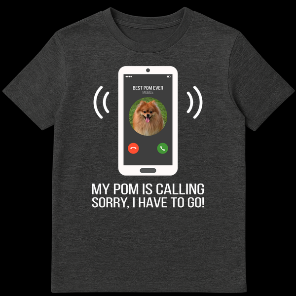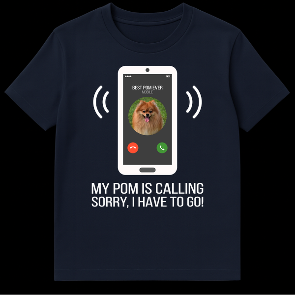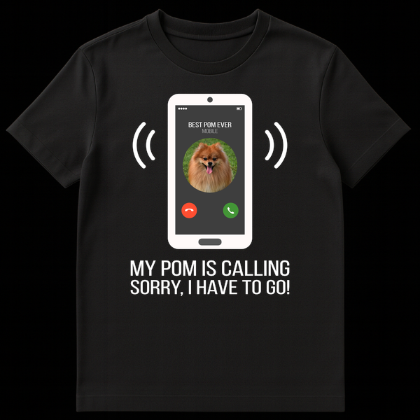 Never miss a call from your furry best friend with this humorous Pomeranian owner t-shirt. Featuring a smartphone screen displaying “BEST POM EVER” and the playful text “MY POM IS CALLING SORRY, I HAVE TO GO!”, it’s a witty nod to every dog parent’s priorities. This design makes a perfect gift for any devoted Pomeranian enthusiast or pet lover.