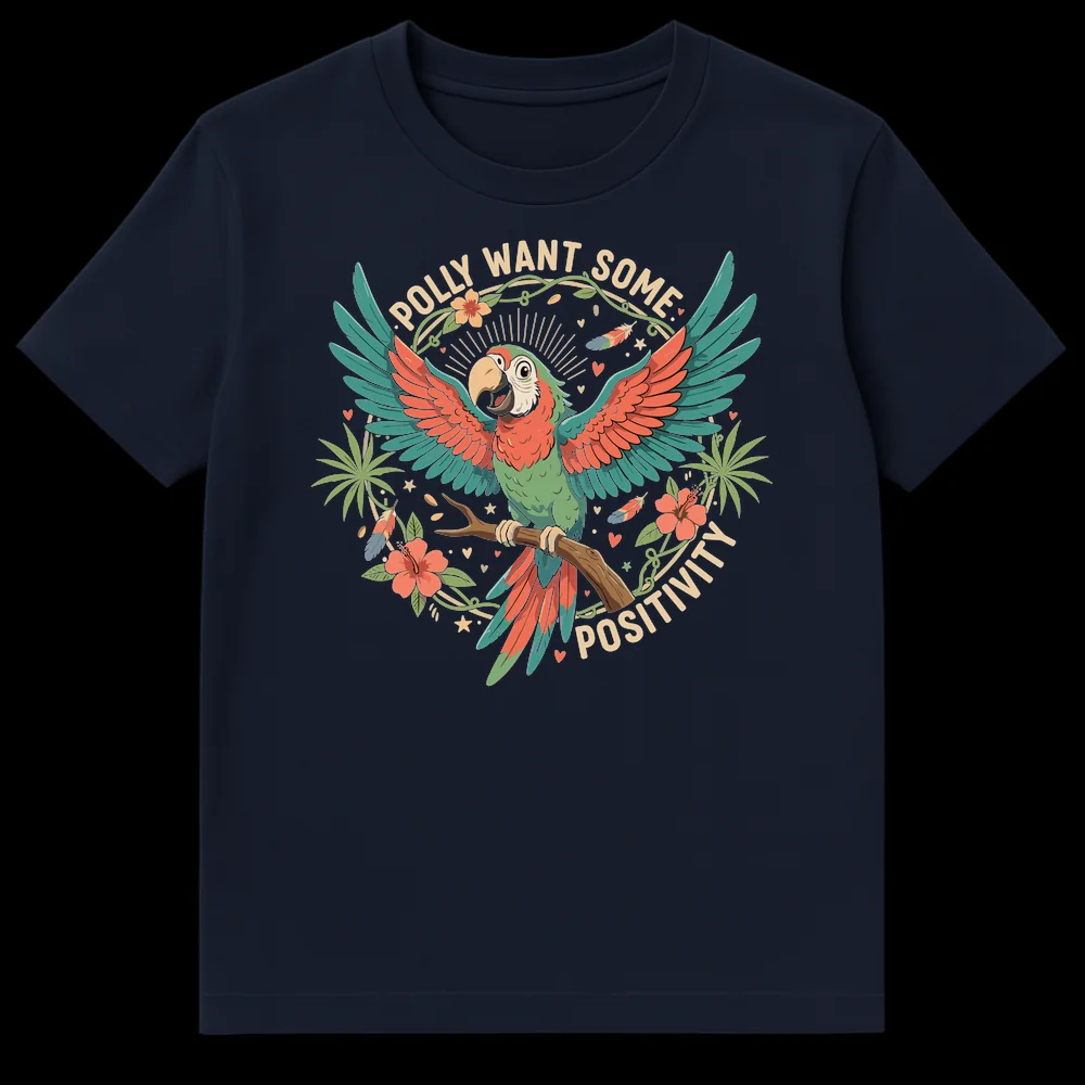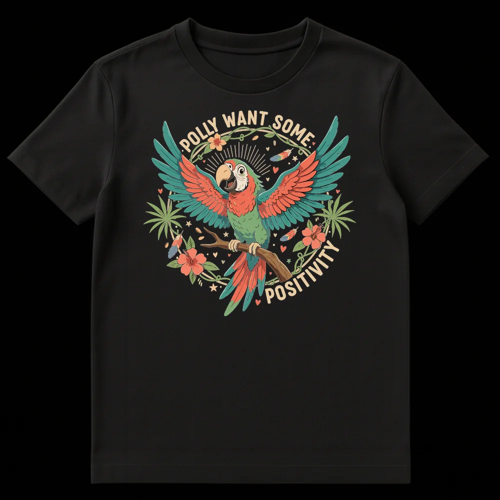 Embrace good vibes with our unique “POLLY WANT SOME POSITIVITY” t-shirt, featuring a vibrant, cartoon-style parrot amidst tropical foliage. This heartwarming design playfully twists a classic phrase into a powerful, encouraging message. Perfect for animal lovers or anyone who enjoys lighthearted humor and spreads optimism, making it a thoughtful gift for friends and family.