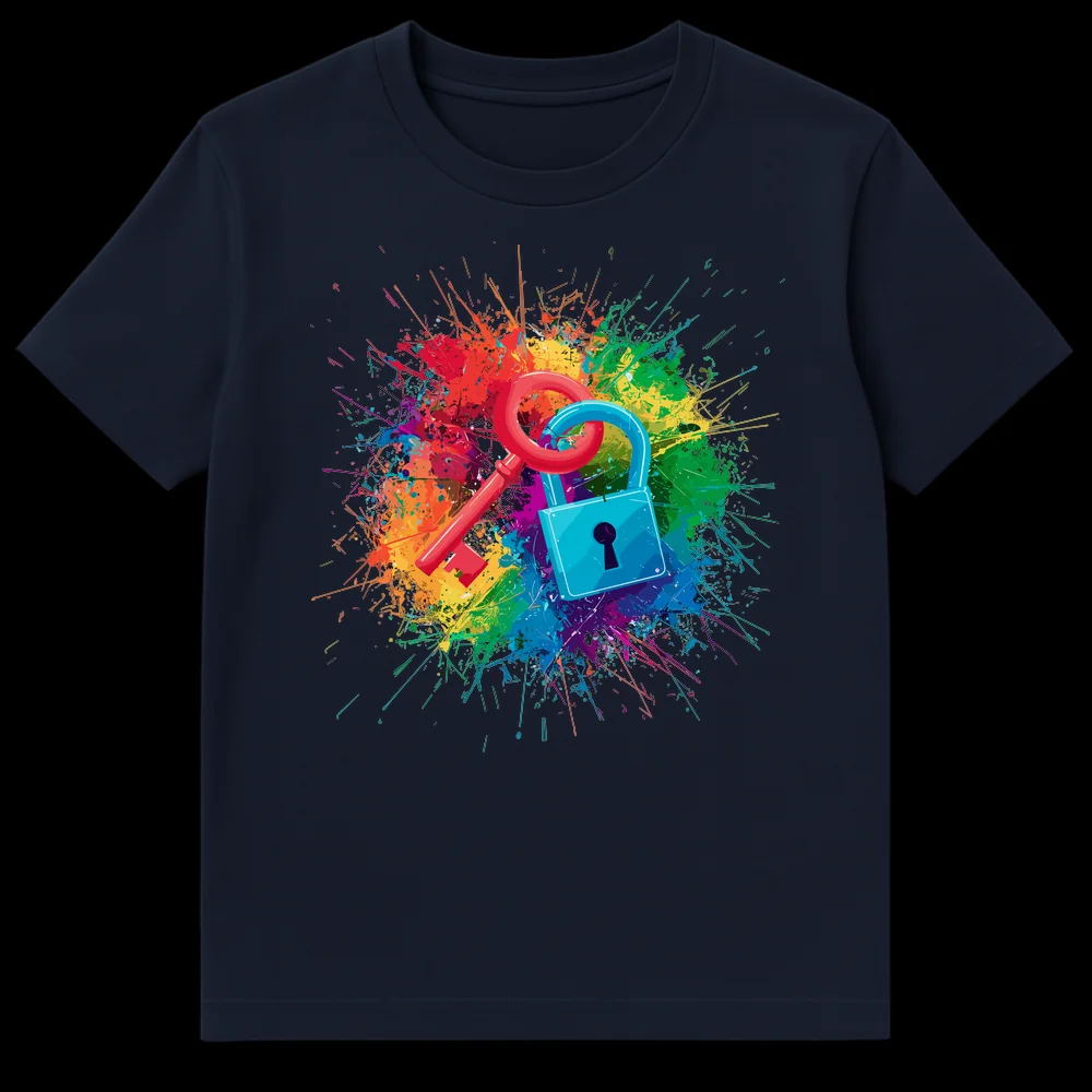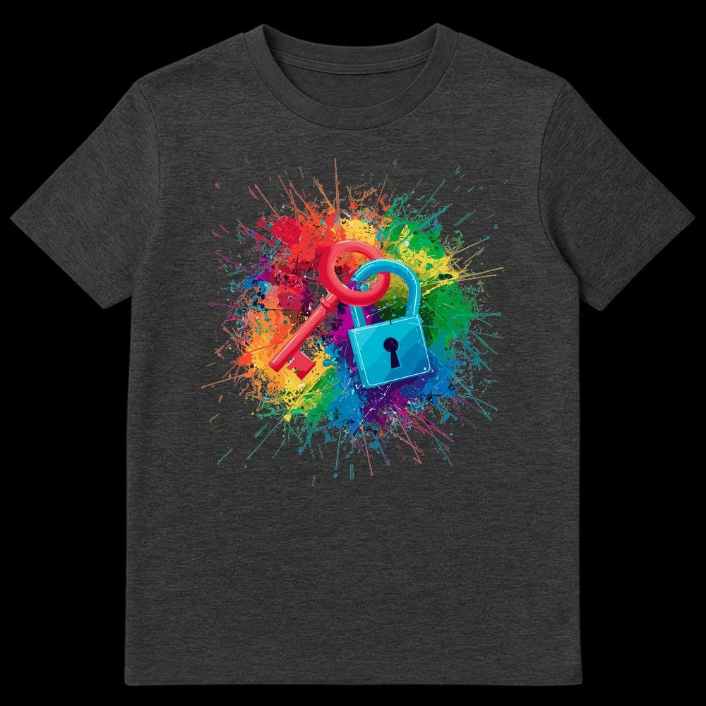 Unleash your vibrant spirit with this eye-catching t-shirt featuring a bold red key and blue padlock, symbolizing solutions and unlocking potential. Set against an explosive backdrop of multicolored paint splatters, this design radiates artistic energy and individual expression. It’s the perfect gift for creative minds and anyone who loves unique, statement-making apparel.