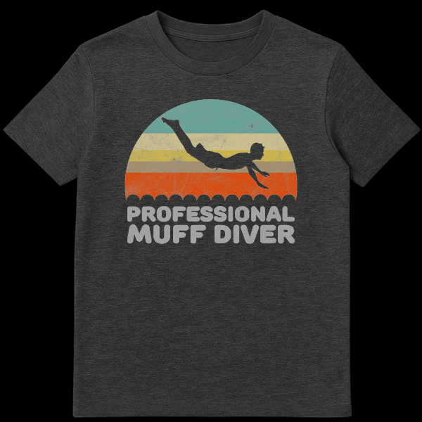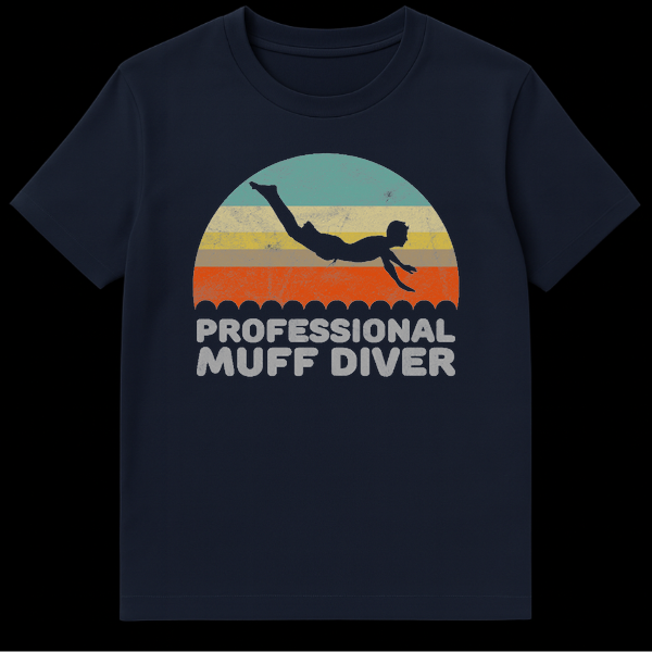 Make a splash with our ‘Professional Muff Diver’ t-shirt, designed for those who appreciate a good laugh and a clever double entendre. The striking graphic features a stylized retro sunset with vibrant, faded stripes of teal, yellow, gold, and orange, setting the scene for a dynamic diver silhouette plunging into a wavy, water-like border. The bold, distressed gray text ‘PROFESSIONAL MUFF DIVER’ adds an undeniable touch of cheeky humor. This shirt is a fantastic way to express a playful personality and is sure to get smiles and knowing glances. Perfect for anyone who loves funny shirts, diving jokes, or unique novelty apparel, it makes an excellent gift for birthdays, holidays, or just because you know someone who’d rock it. Grab this conversation-starting tee and show off your sense of humor!