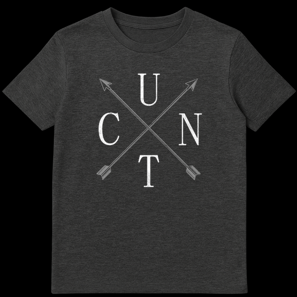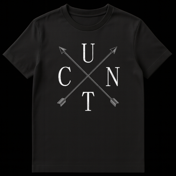 Make a daring statement with our uniquely clever t-shirt, designed for the truly audacious. This bold graphic tee presents the letters U, N, T, C in a cruciform pattern around intersecting arrows, creating a design that’s more than meets the eye. What initially seems like a minimalist arrangement transforms into the explicit word “CUNT” upon closer inspection, delivering a powerful punchline for those in the know. Crafted with a distressed, vintage-inspired aesthetic in a striking black and off-white monochromatic palette, this shirt blends grunge typography with sharp, clean lines for an iconic look. It’s the ultimate conversation starter, intended to provoke thought, amusement, or even a bit of outrage. This design isn’t just clothing; it’s an act of defiance, a nod to anti-establishment humor, and a testament to clever visual wordplay. Ideal for anyone who loves dark humor, embraces shock value, or enjoys challenging conventions with their wardrobe. Gift this to the friend who has everything, except a shirt that truly embodies their rebellious spirit and appreciation for taboo wit.