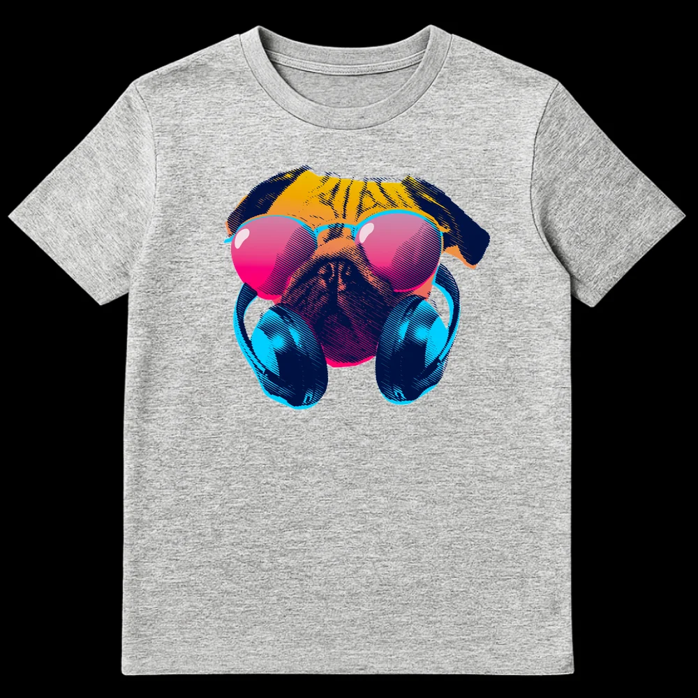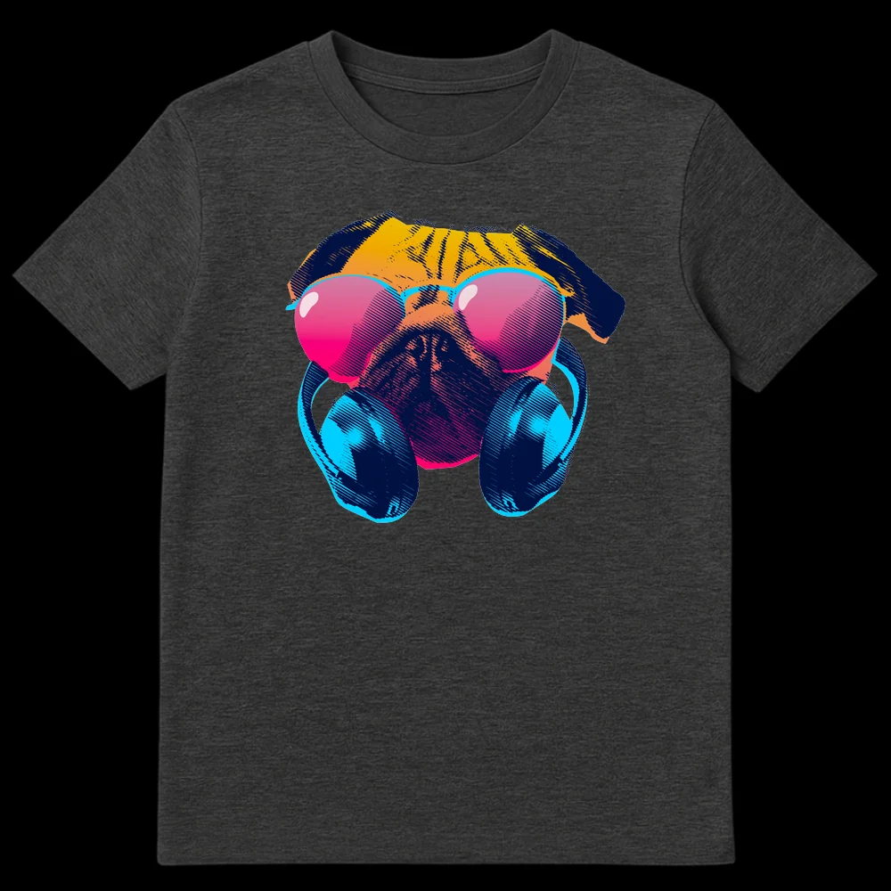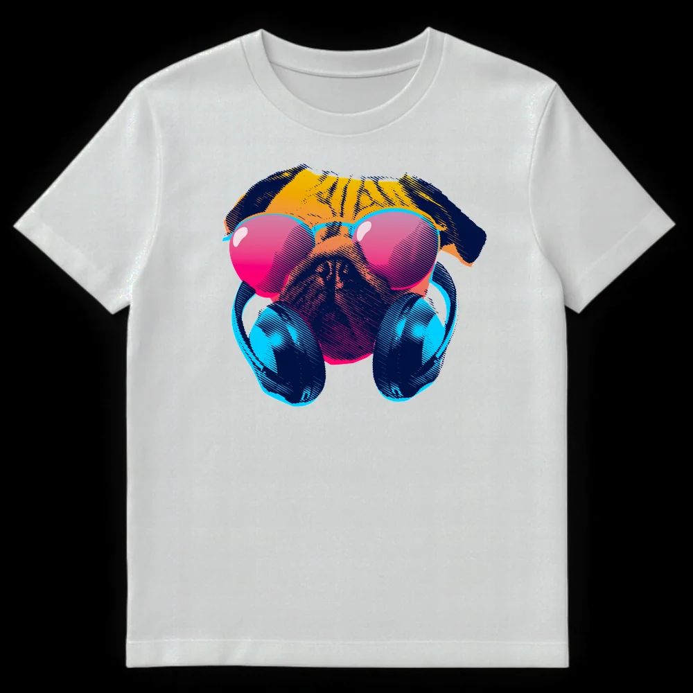 Step into the synthwave with our “Cool Pug” T-shirt, featuring a pug rocking vibrant neon sunglasses and headphones in a retro-futuristic style. This unique design captures the playful charm of a pug with a distinct 80s vaporwave aesthetic, making it a standout piece. It’s the perfect gift for pug lovers, electronic music fans, or anyone who appreciates quirky, stylish animal apparel with a nostalgic vibe.