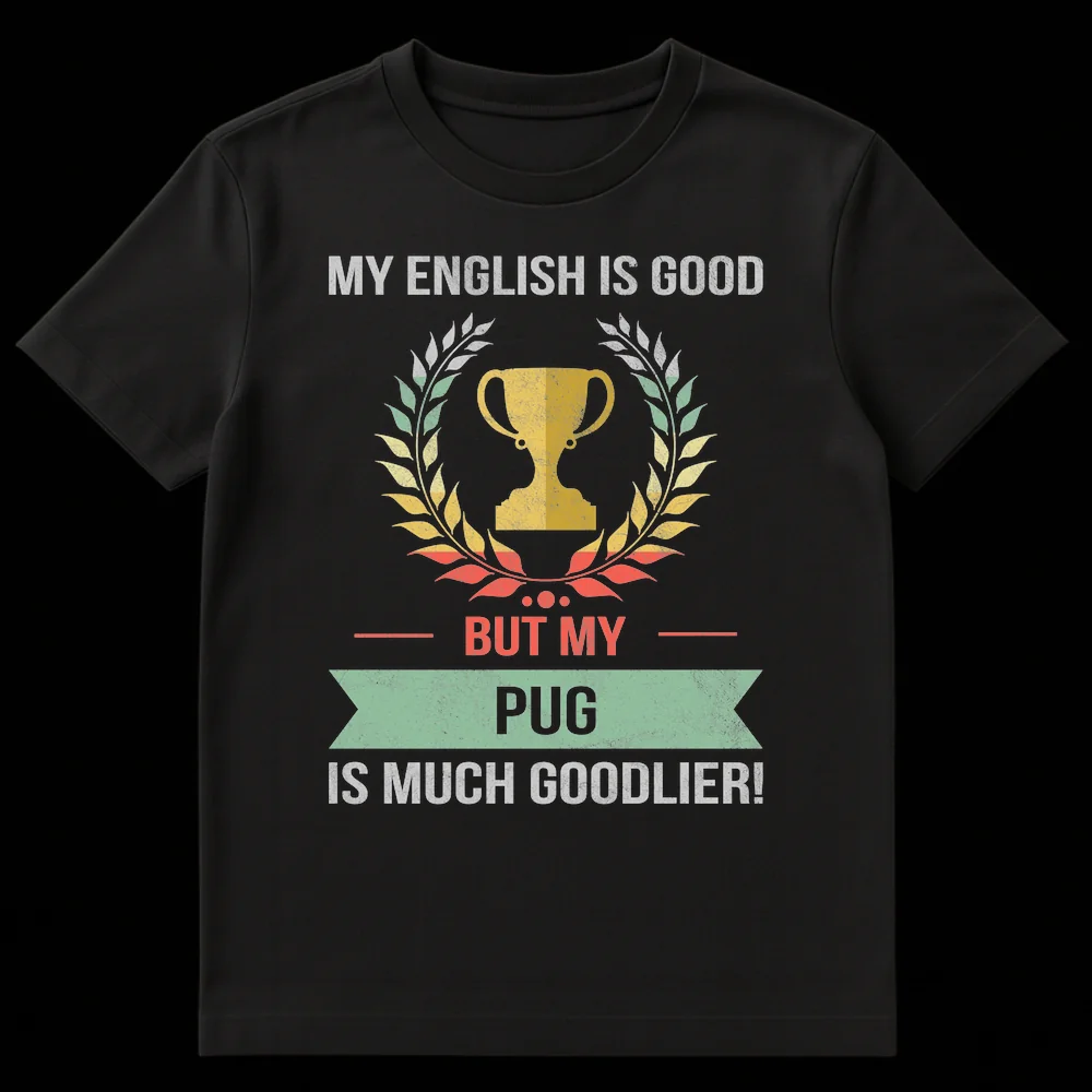 Celebrate your beloved canine with our “MY ENGLISH IS GOOD BUT MY PUG IS MUCH GOODLIER!” t-shirt. This funny design features a vintage trophy and laurel wreath graphic, humorously highlighting a pug’s superior ‘goodness’ over perfect grammar. It’s a perfect conversation starter and an ideal gift for any passionate pug owner or dog enthusiast who appreciates a clever, lighthearted pun.
