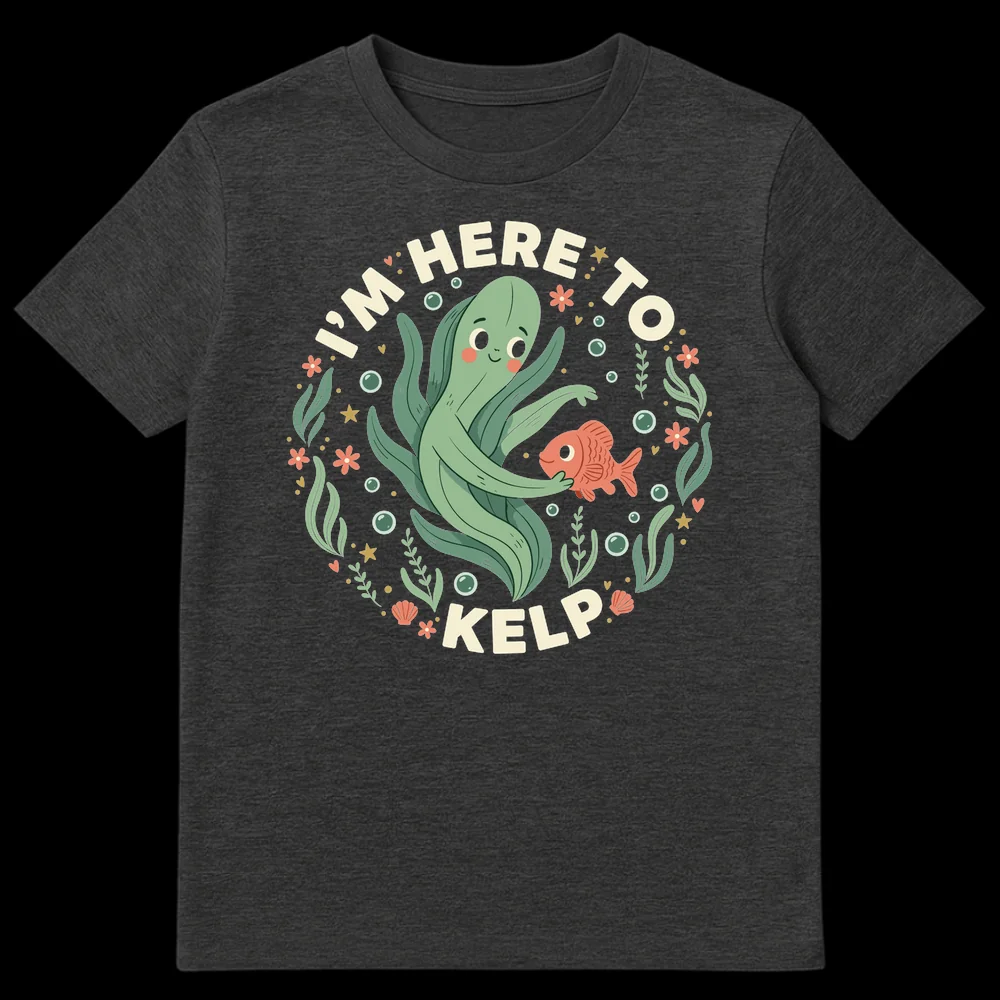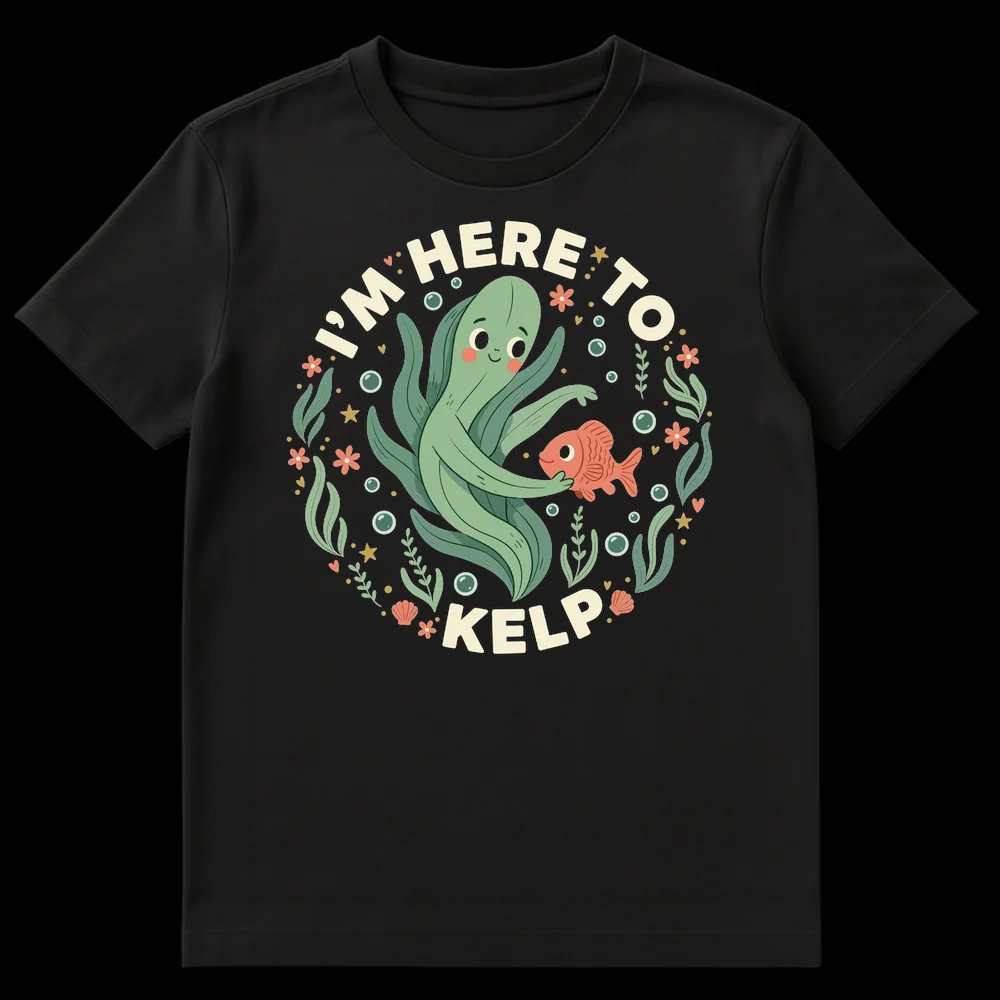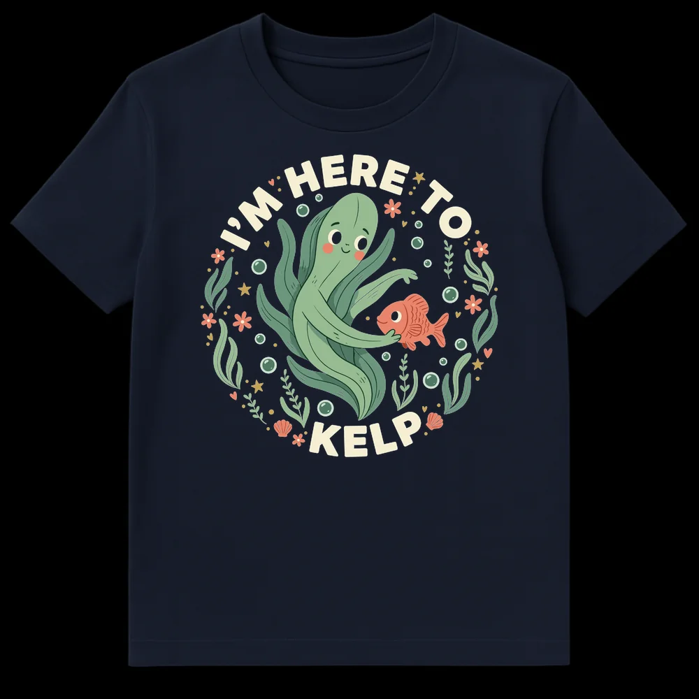 Dive into laughter with our “I’M HERE TO KELP” t-shirt, featuring an adorable, helpful kelp character embracing a friendly fish in a vibrant underwater scene. This clever design playfully twists the phrase “I’m here to help,” making it a perfect conversation starter. Ideal for ocean lovers, marine enthusiasts, or anyone who appreciates a good, wholesome pun. It’s a charming gift that combines wit with a cute, unique aesthetic.