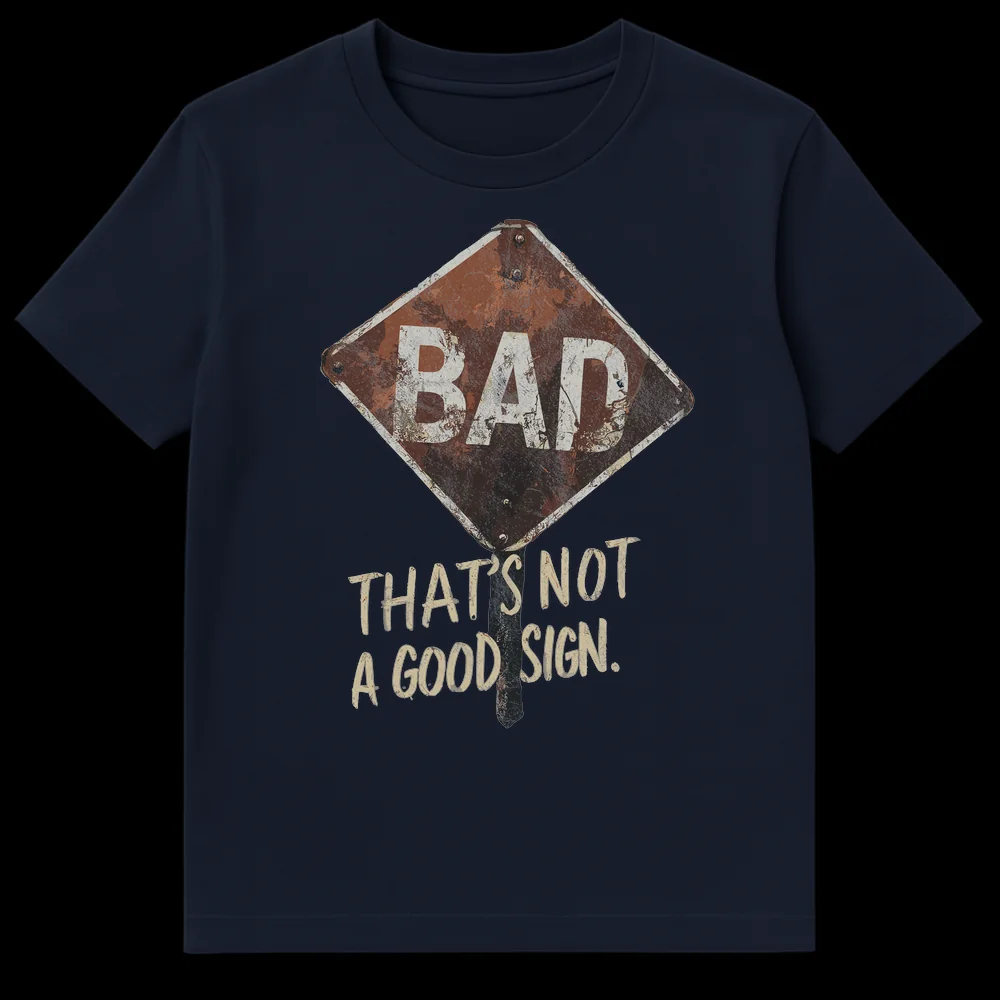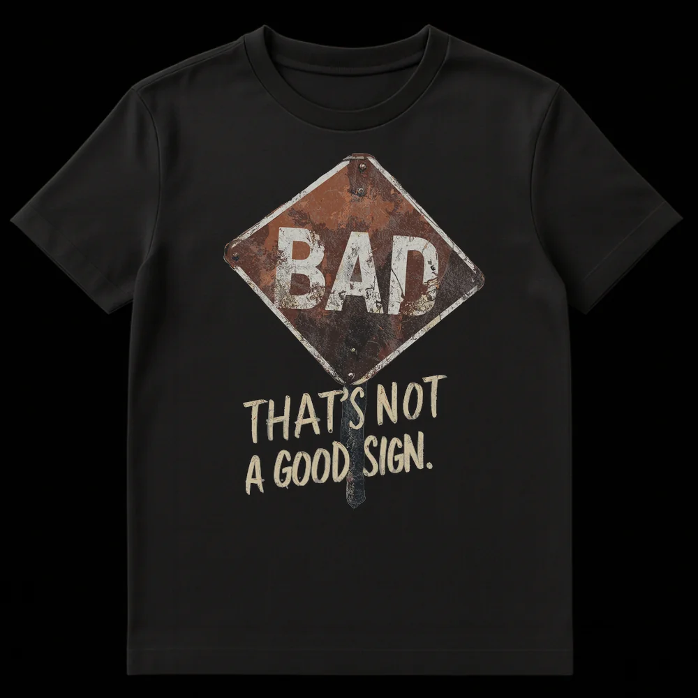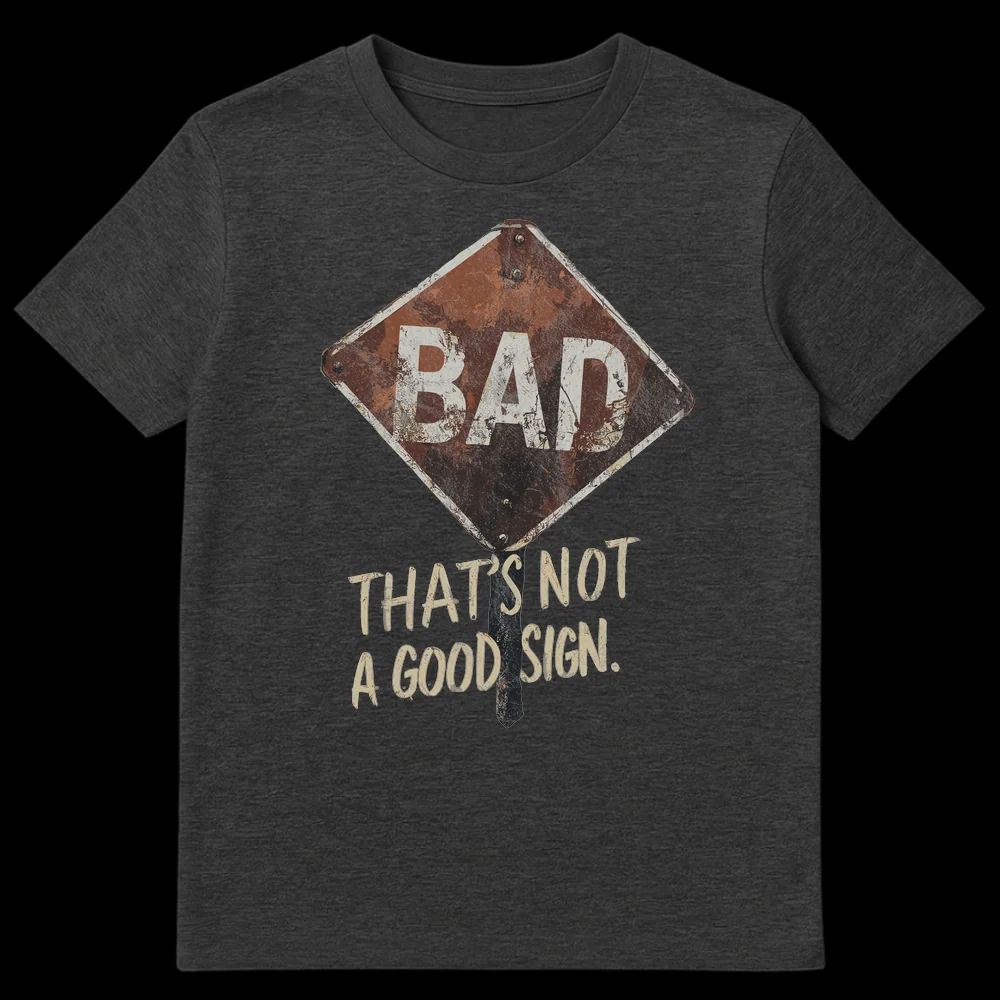 Embrace the wit with our ‘BAD THAT’S NOT A GOOD SIGN.’ T-shirt. This design cleverly plays on the double meaning of ‘sign,’ making it perfect for those who appreciate sharp, observational humor. Featuring a distressed, grunge aesthetic reminiscent of a rusty warning sign, it offers a visually striking and amusing statement. A great gift for dad joke enthusiasts or anyone with a dry, ironic sense of humor.
