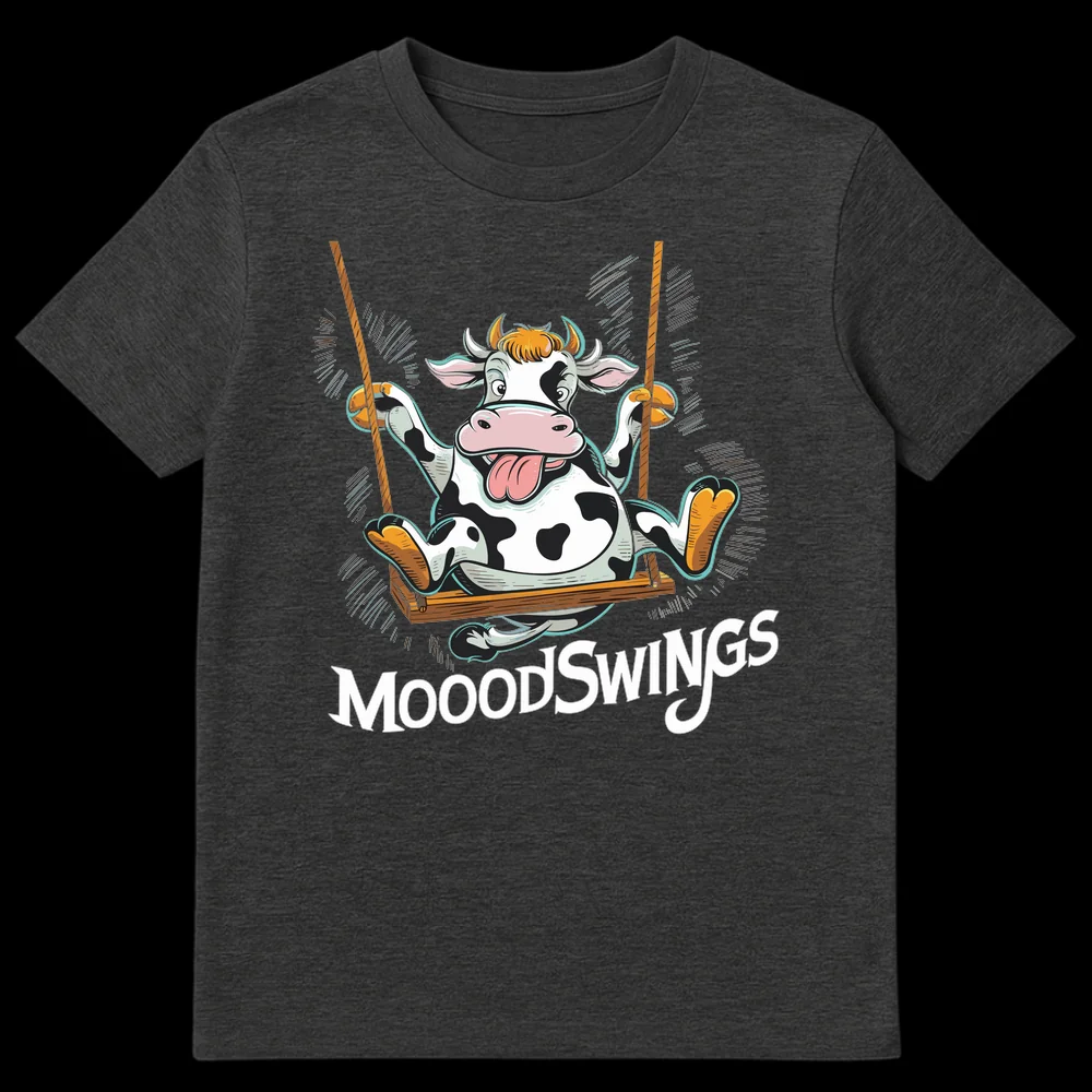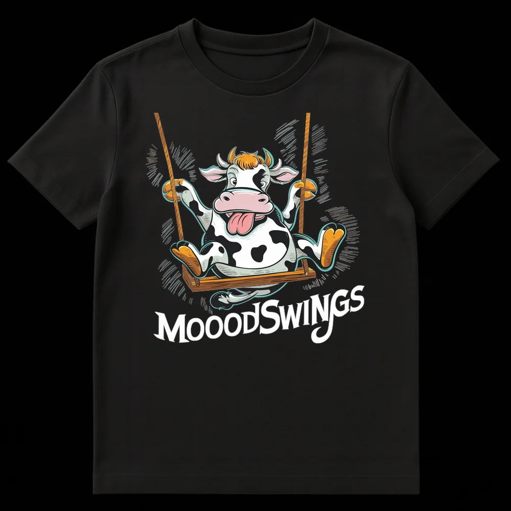 Swing into a good mood with our irresistibly charming ‘MOOODSWINGS’ t-shirt, a witty take on the classic phrase with a delightful animal twist! This unique graphic tee showcases a cheerful, anthropomorphic Holstein cow with a playful expression, joyfully soaring on a rustic swing. The design cleverly replaces ‘Mood’ with ‘Mooood’ to create a hilarious pun that’s both relatable and incredibly cute. Crafted in a vibrant cartoon style with bold outlines and a rich color palette, this shirt is designed to stand out. It’s perfect for those who appreciate clever wordplay, have an affinity for farm animals, or playfully acknowledge their own emotional rollercoasters. This whimsical and self-aware design makes a fantastic gift for friends and family who enjoy lighthearted humor, cow-themed apparel, or simply love a good pun. Wear it to spark smiles and conversations, projecting a relaxed, cheerful, and charming personality in any casual setting.