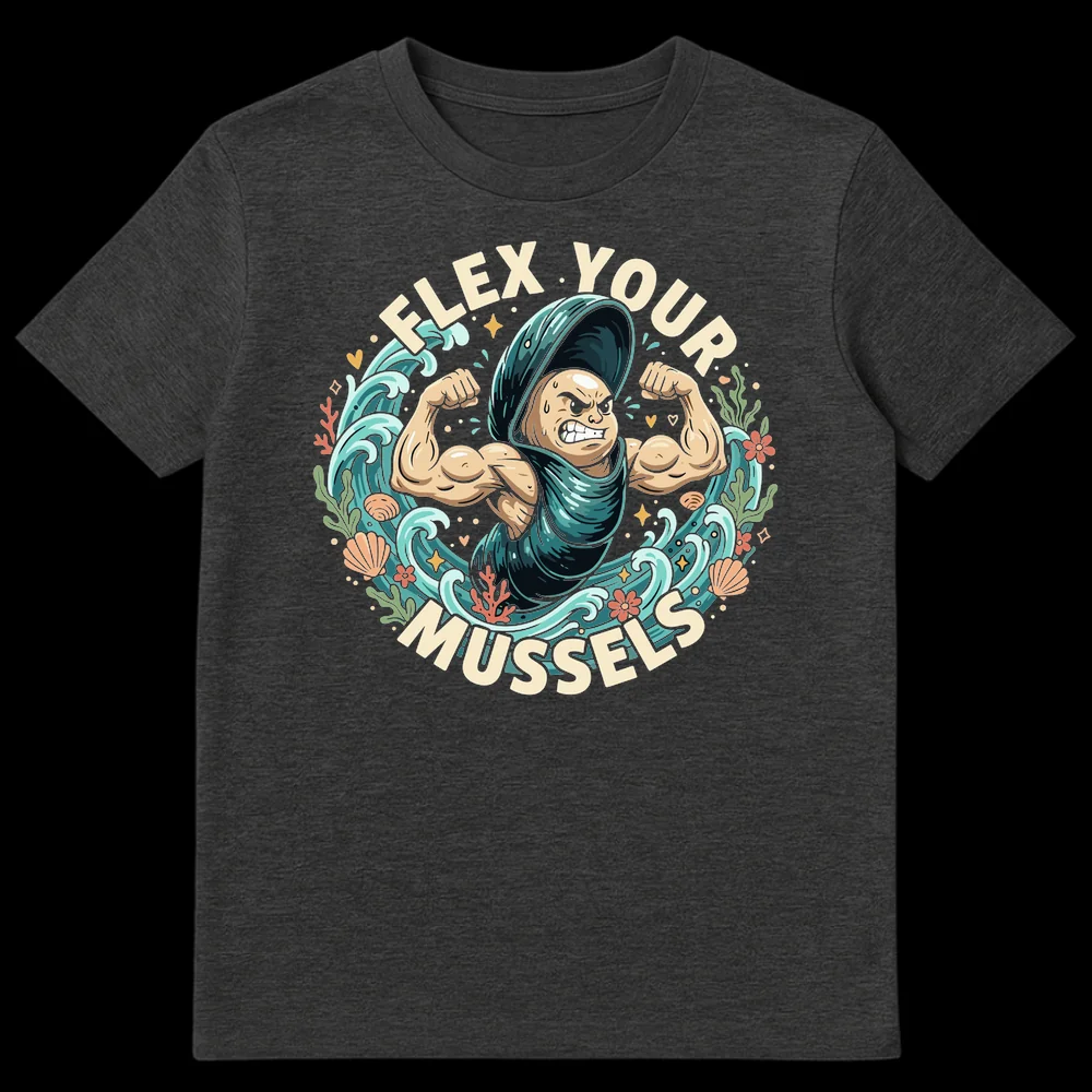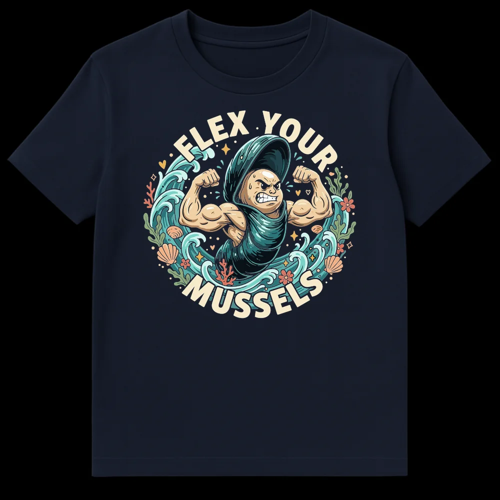 Dive into laughter with our “Flex Your Mussels” t-shirt, featuring a hilarious anthropomorphic mussel flexing its bicep amidst vibrant ocean life. This clever design is a perfect visual pun for anyone who appreciates a good dad joke or loves the sea. It’s an ideal gift for gym enthusiasts, marine biology lovers, or anyone with a great sense of humor.
