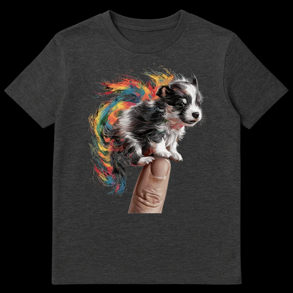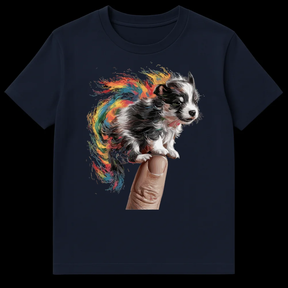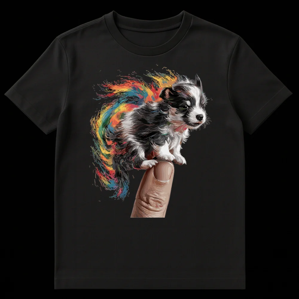 Embrace the magic of a small wonder with this captivating t-shirt, featuring an adorable puppy delicately balanced on a finger, surrounded by a vibrant rainbow energy burst. This unique design captures the joyful spirit and cuteness of puppies, making it a perfect statement piece. It’s an ideal gift for dog moms, puppy owners, or anyone who adores cute animals and expressive art.